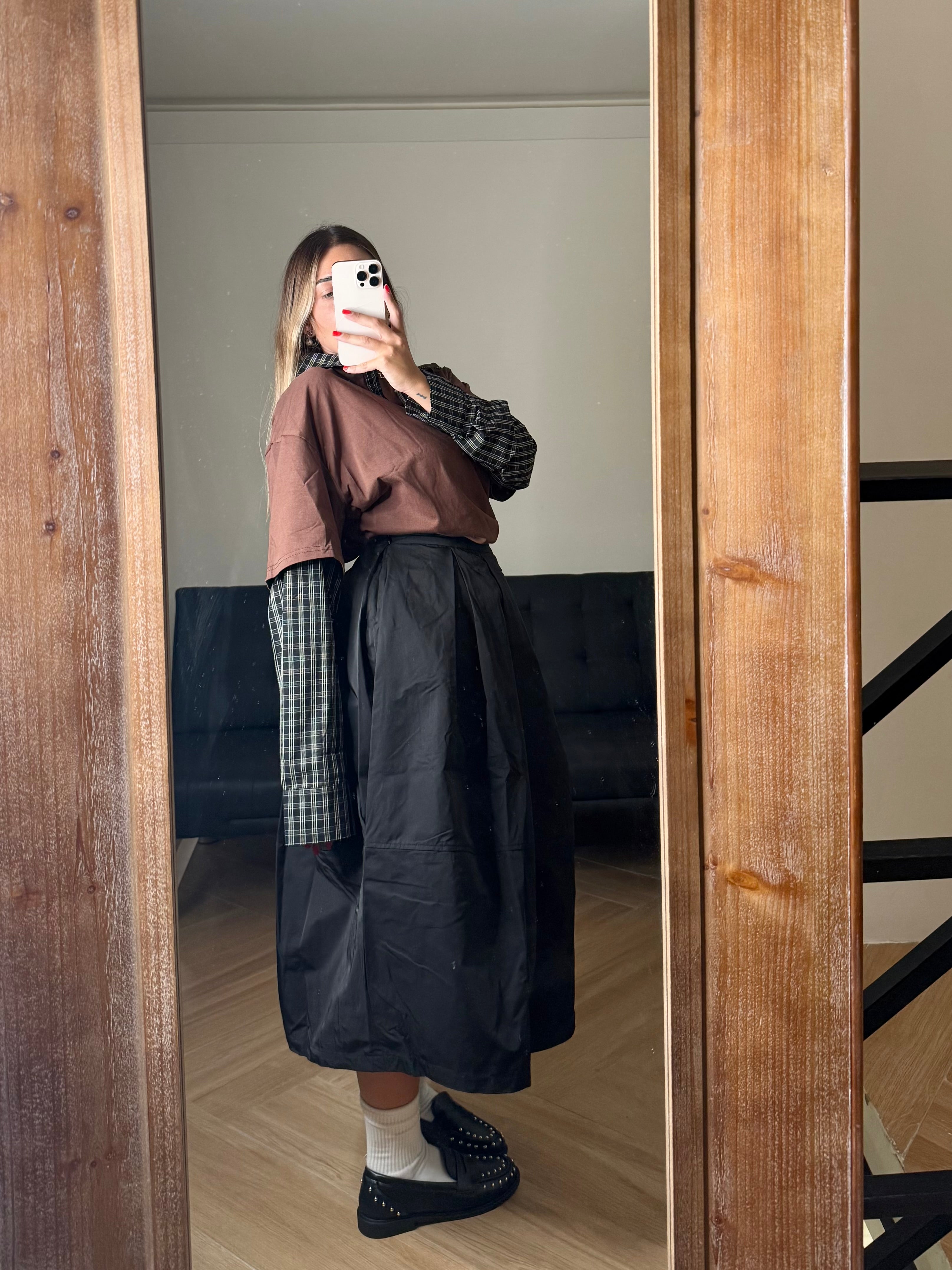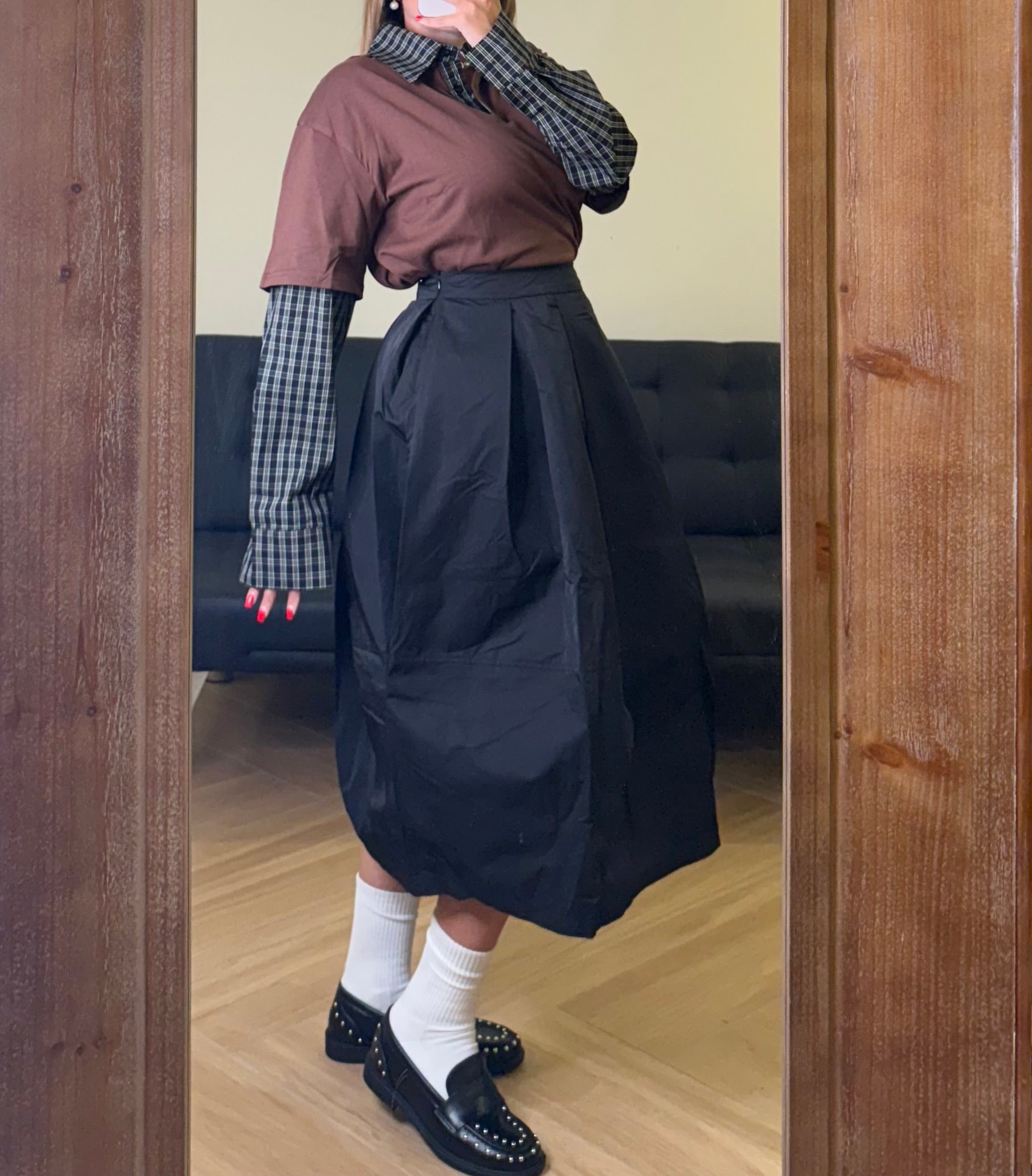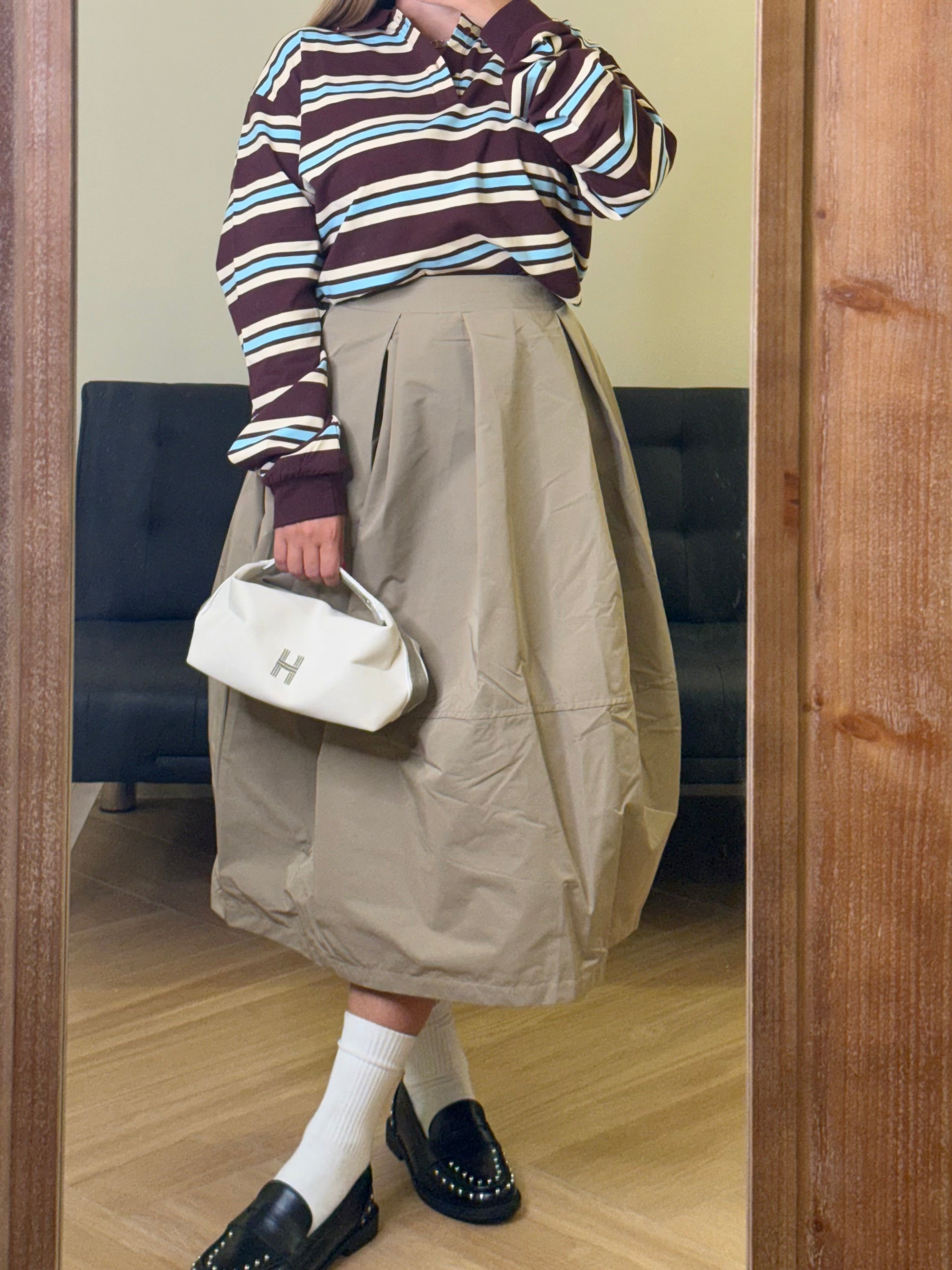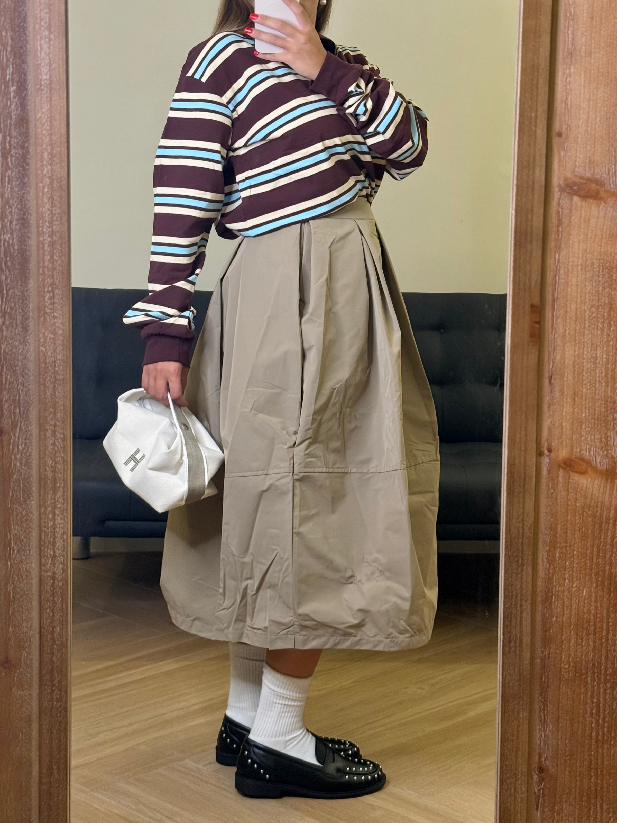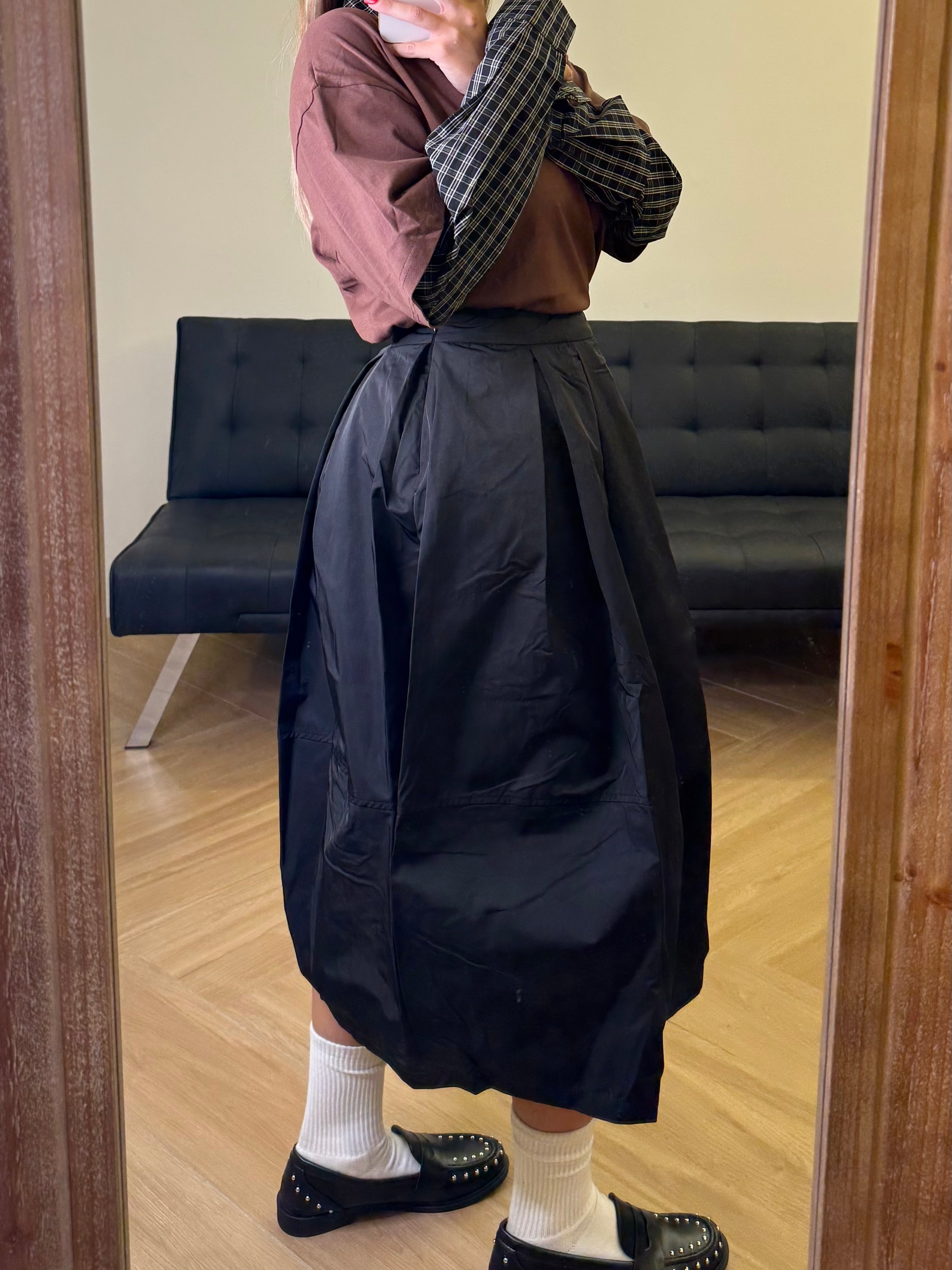 Un capo che incarna l’anima dell’alta moda. La gonna midi in taffetà, dal volume strutturato e leggermente scultoreo, richiama le forme essenziali del design giapponese, reinterpretandole con eleganza contemporanea. Il tessuto brillante e corposo dona movimento ad ogni passo, evocando le atmosfere raffinate delle passerelle parigine. Un pezzo esclusivo, pensato per chi ama distinguersi con un’eleganza sofisticata e senza tempo