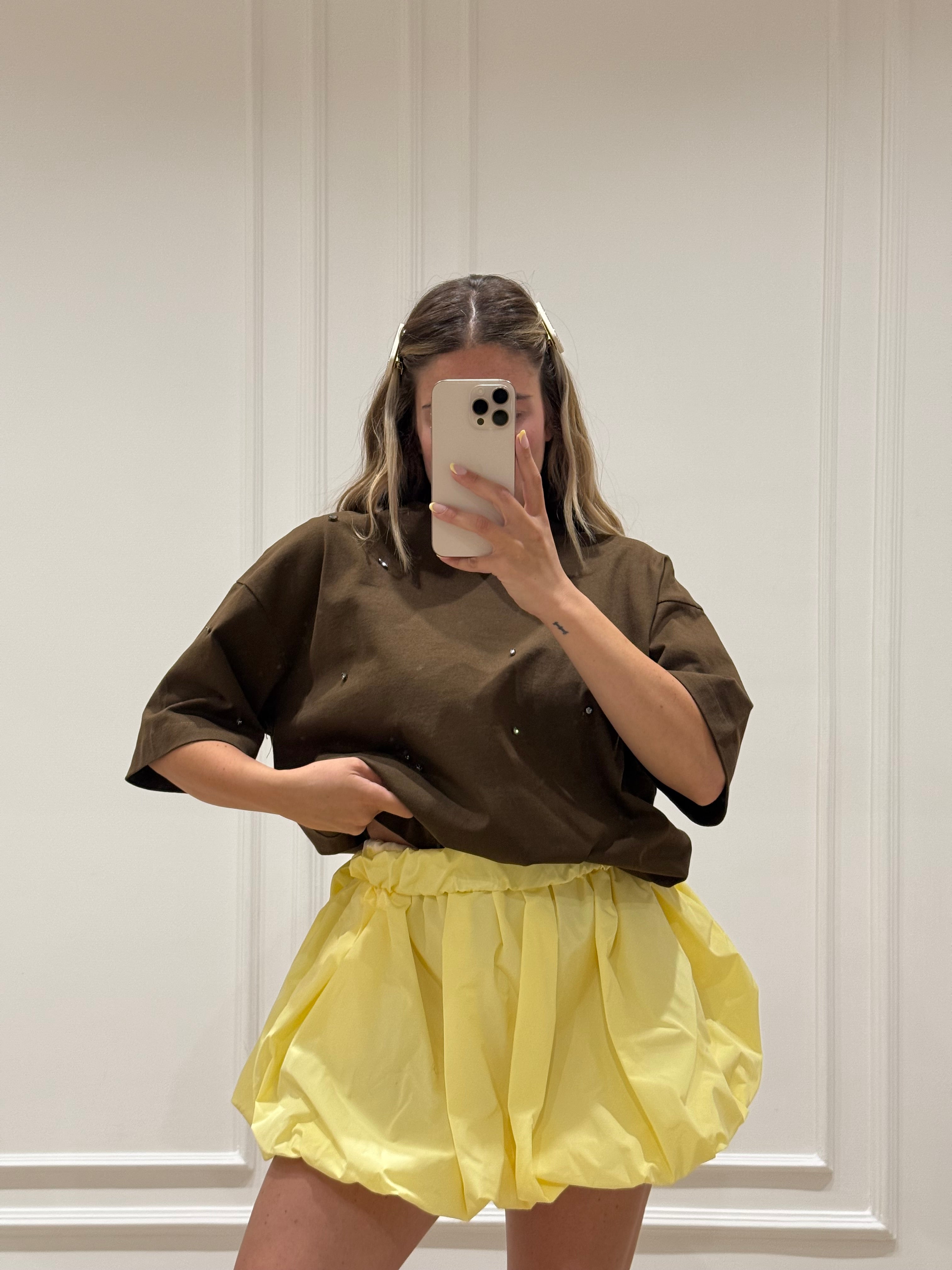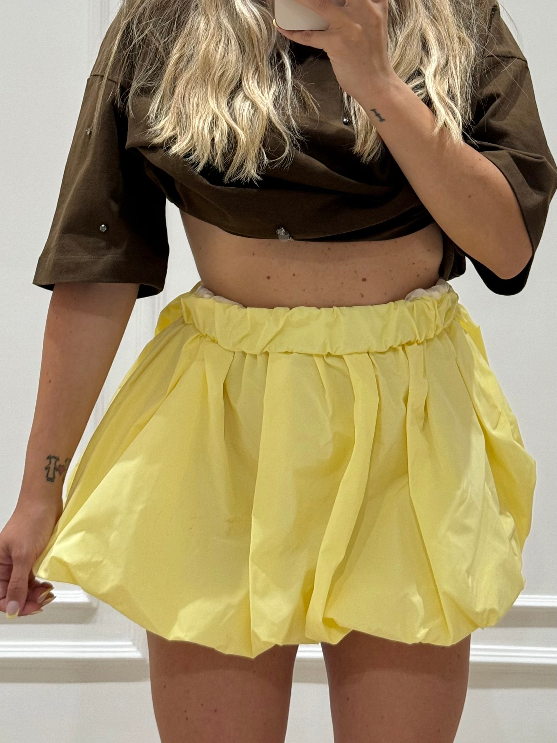 Il colore giallo è vivace e solare, perfetto per le giornate di sole e le serate estive. Il tessuto taffeta semilucido aggiunge un tocco di eleganza e raffinatezza a questa gonna già di per sé unica.