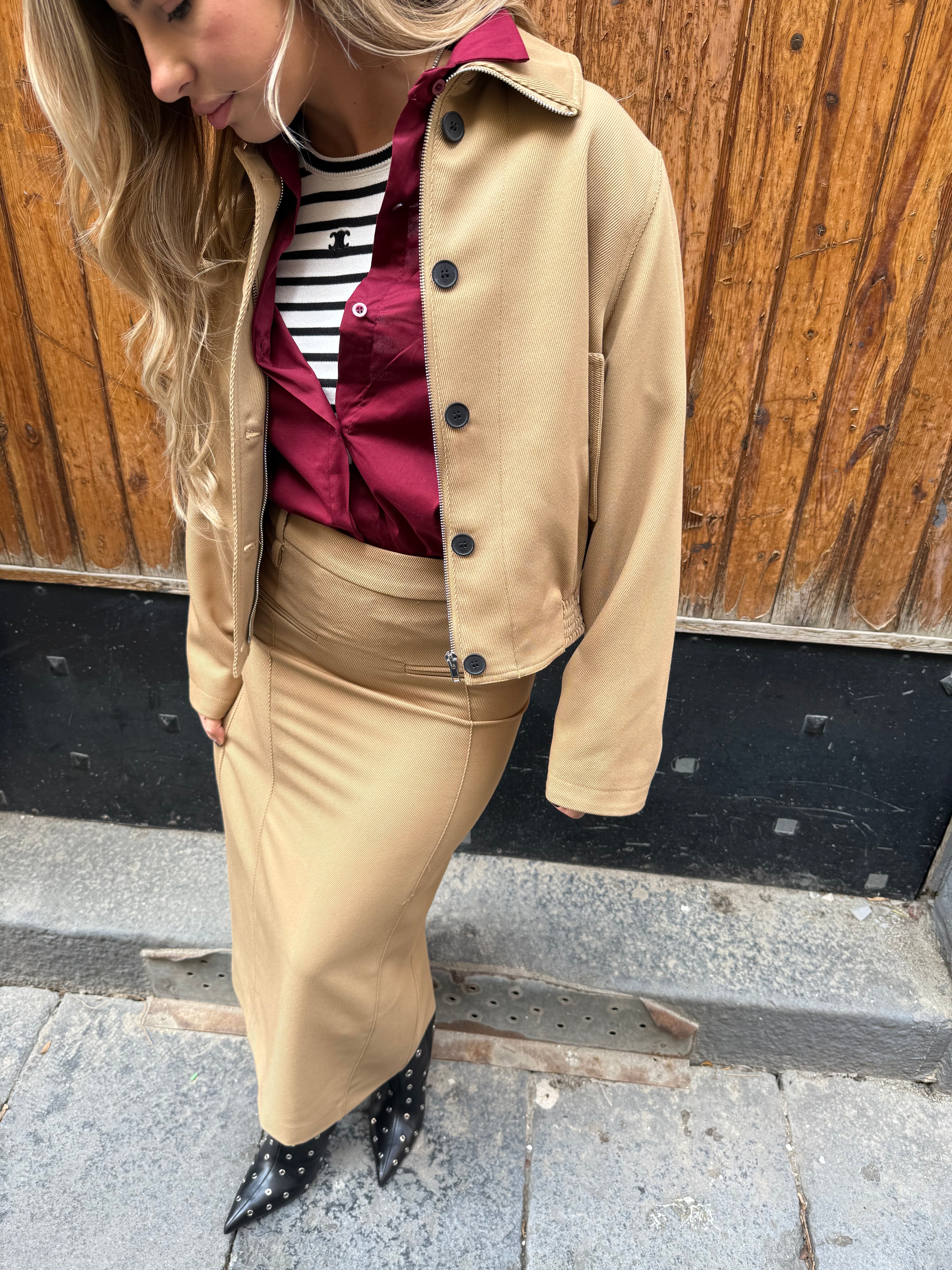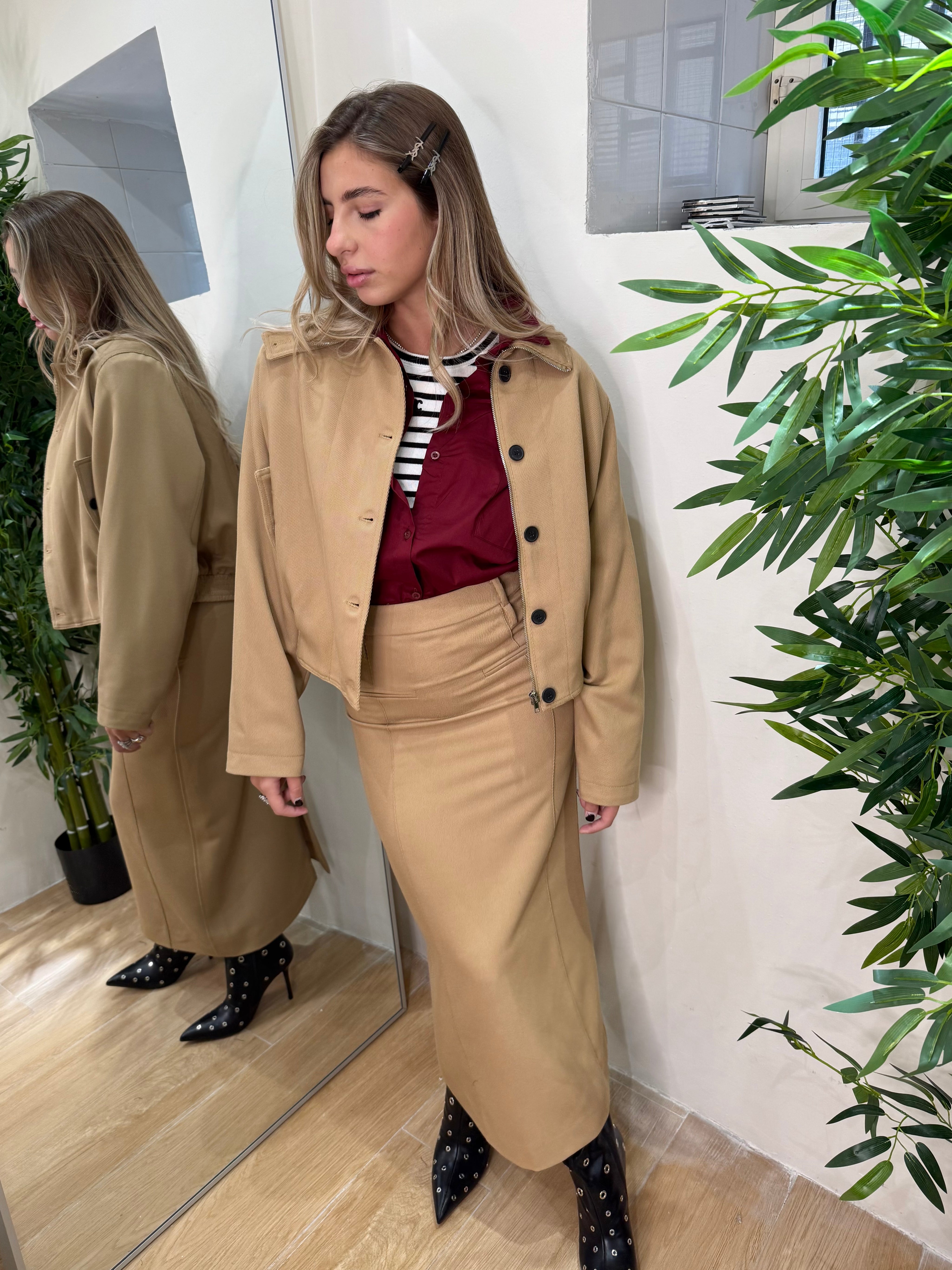 Sira è una gonna lunga dal design elegante e rigoroso, pensata per chi ama uno stile minimal ma deciso. Il tessuto Lumina beige conferisce un effetto luminoso e raffinato, mentre il taglio pulito e lineare sottolinea la perfezione della silhouette.