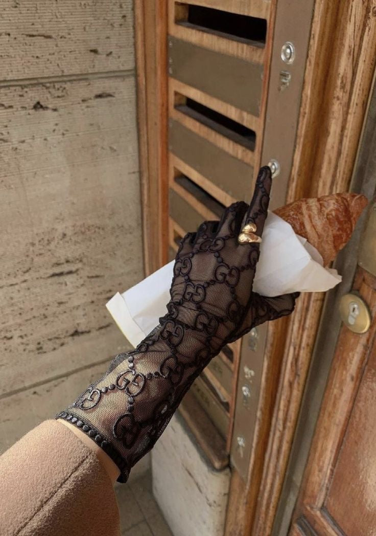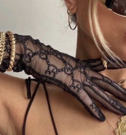 Guanti in tulle nero con motivo logato inspired, ricamati su tutta la mano per un effetto ultra chic. La rete fine esalta la pelle e dona quell’aura elegante, sensuale e da vera fashion muse. Ideali per dare un twist luxury a blazer, slip dress e look da sera. Un accessorio iconico che completa qualsiasi outfit.