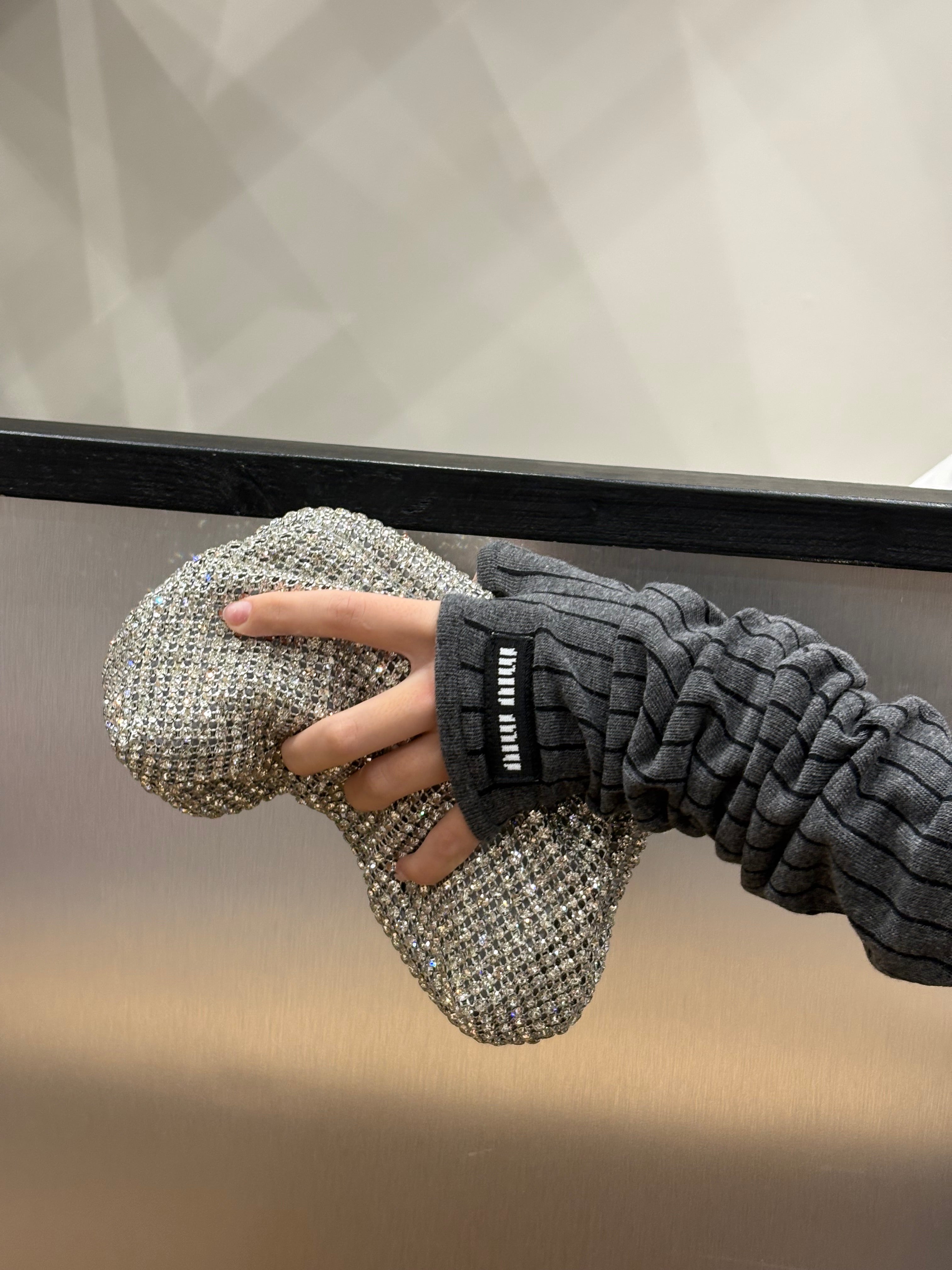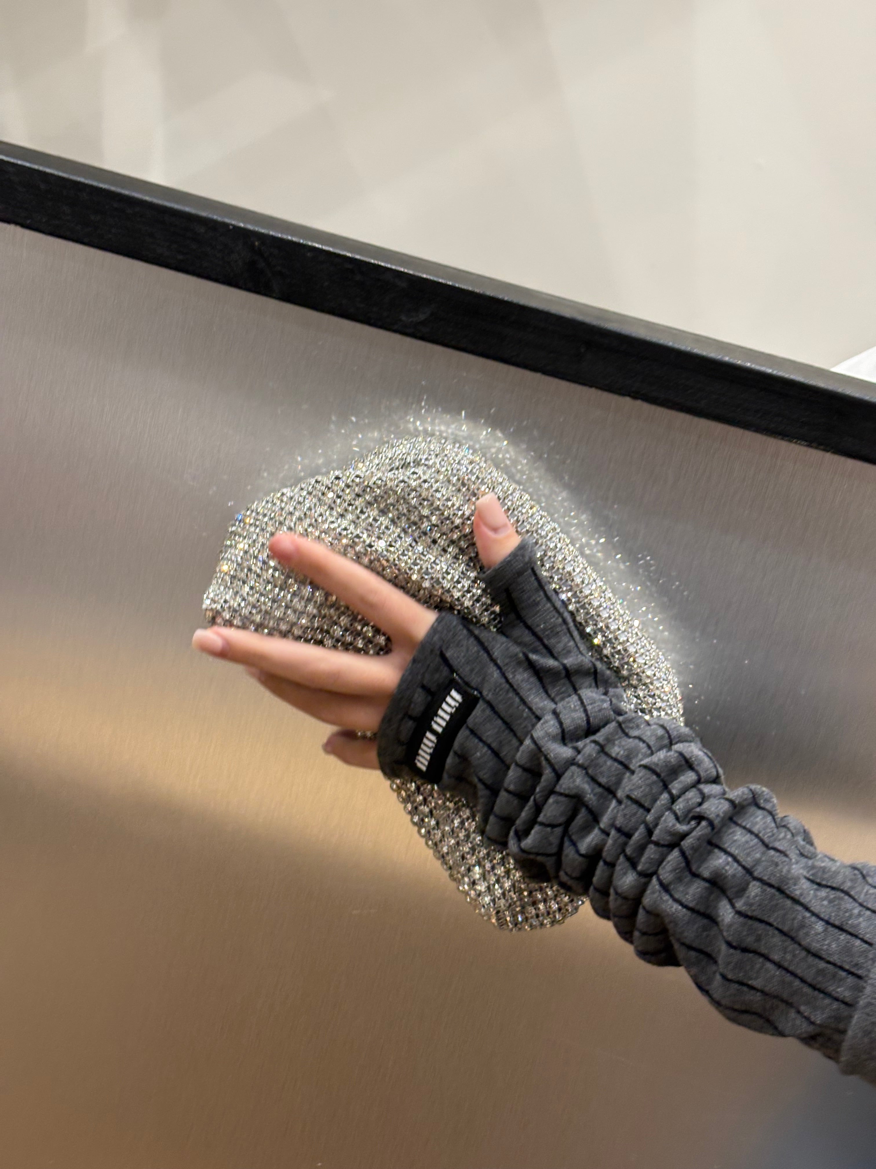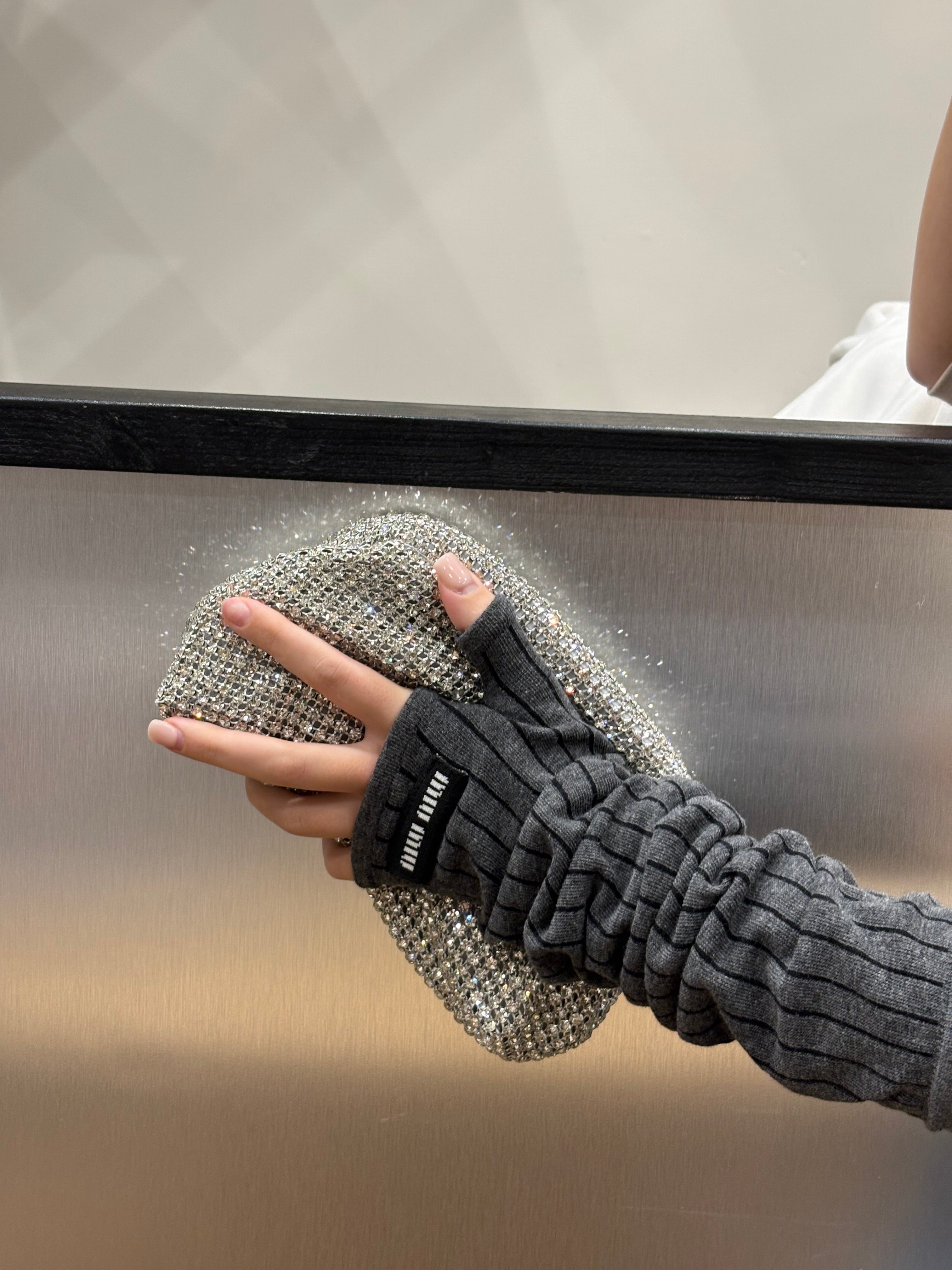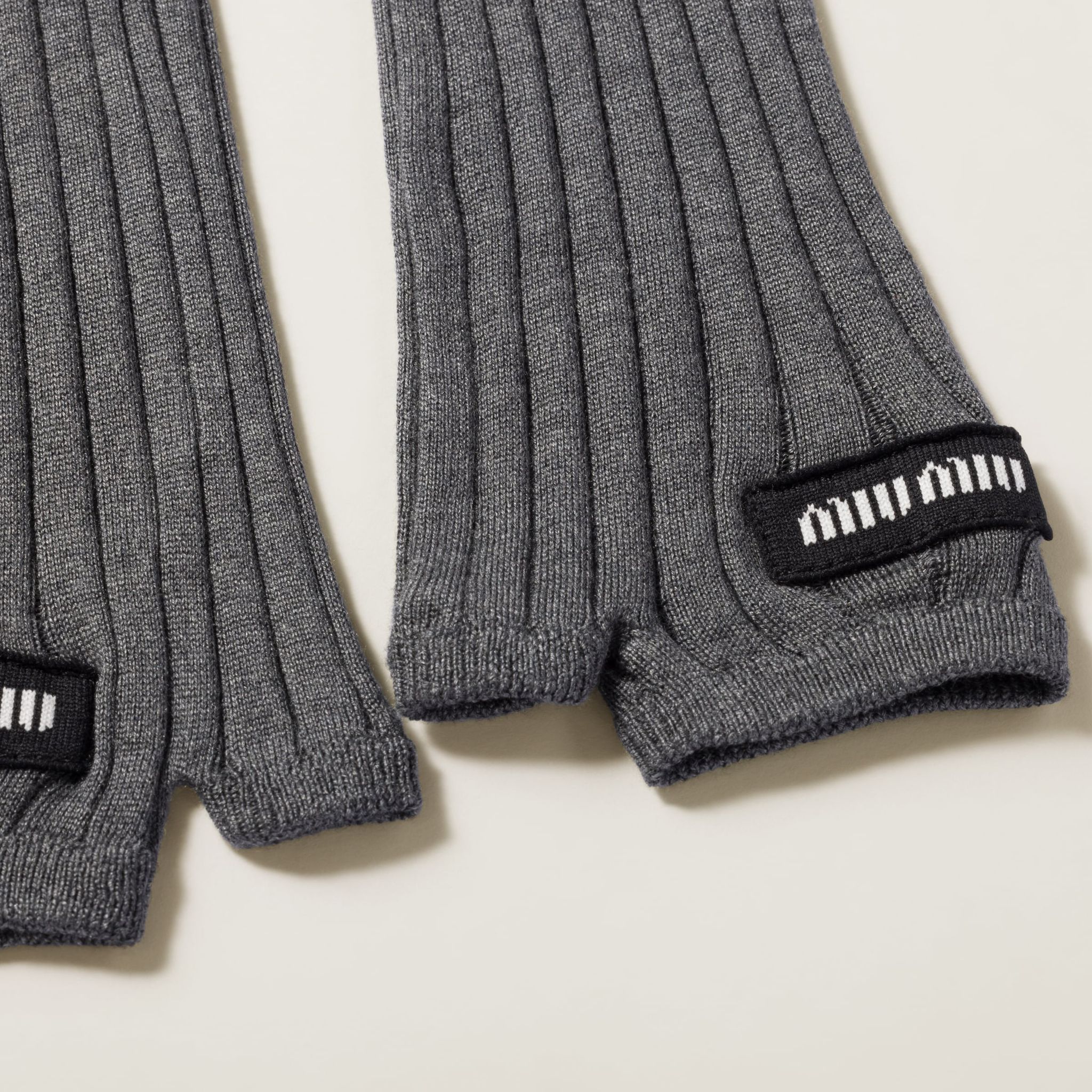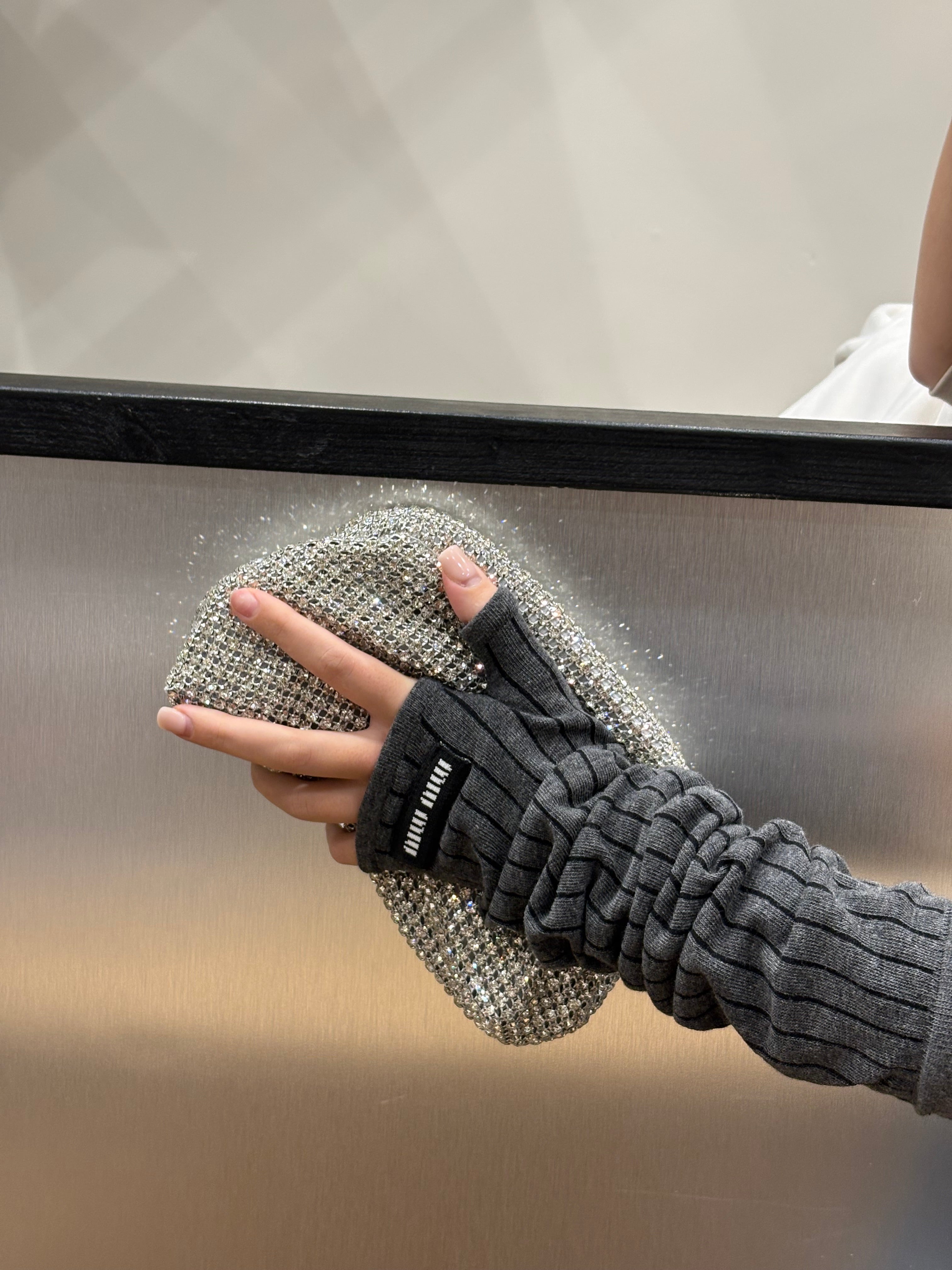 Comodi e di tendenza, i guanti Miu Miu in lana grigia presentano un motivo rigato e design senza dita. Ideali per la stagione fredda, garantiscono libertà di movimento mantenendo un look sofisticato e contemporaneo.