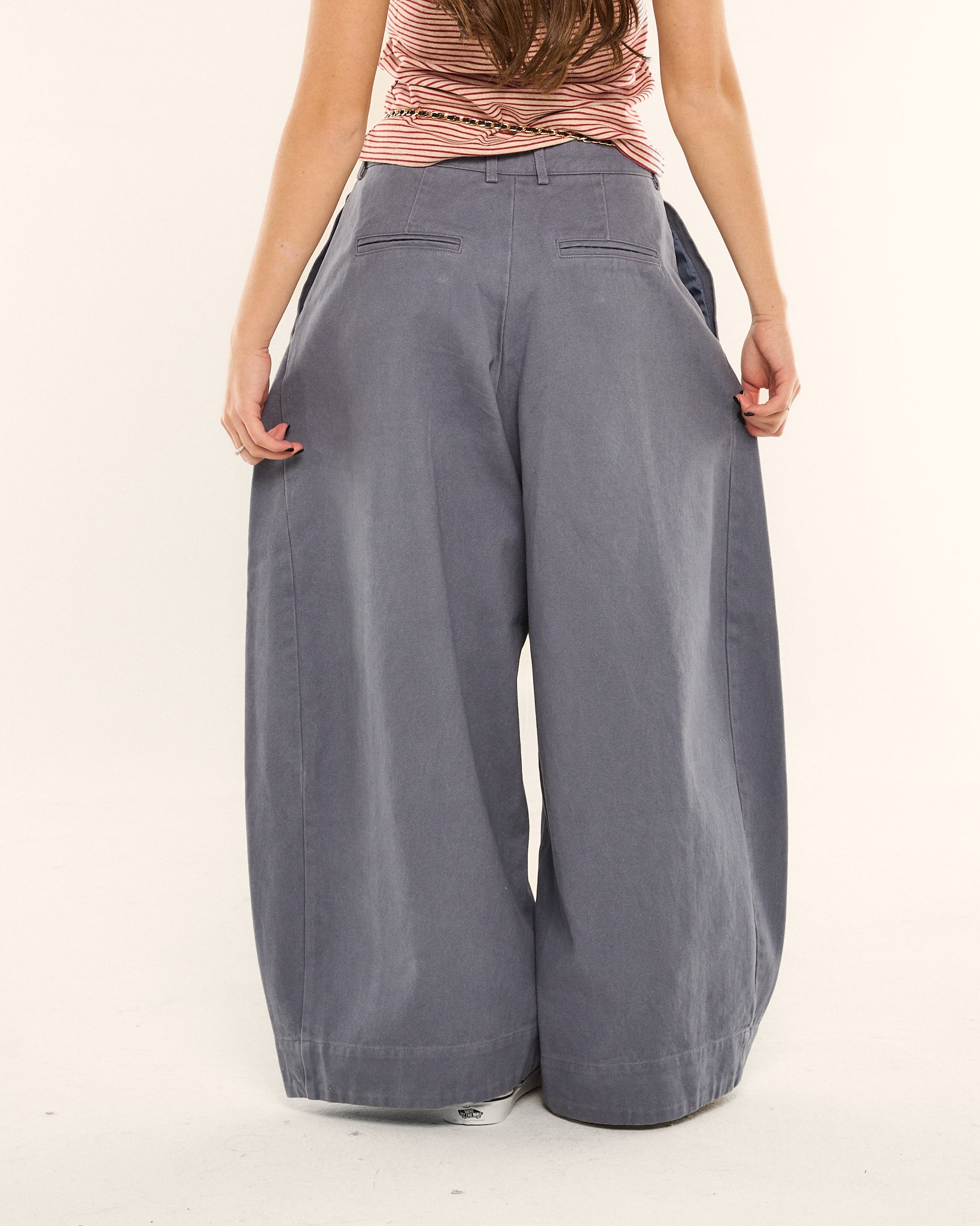 Pantalone a vita alta dal taglio ampio e fluido, linea palazzo strutturata con piega centrale che slancia la figura. Tessuto compatto ma leggero, caduta morbida e movimento deciso. Tasche laterali, chiusura frontale pulita. Vestibilità over controllata, perfetto per look minimal, urbani o più sofisticati.