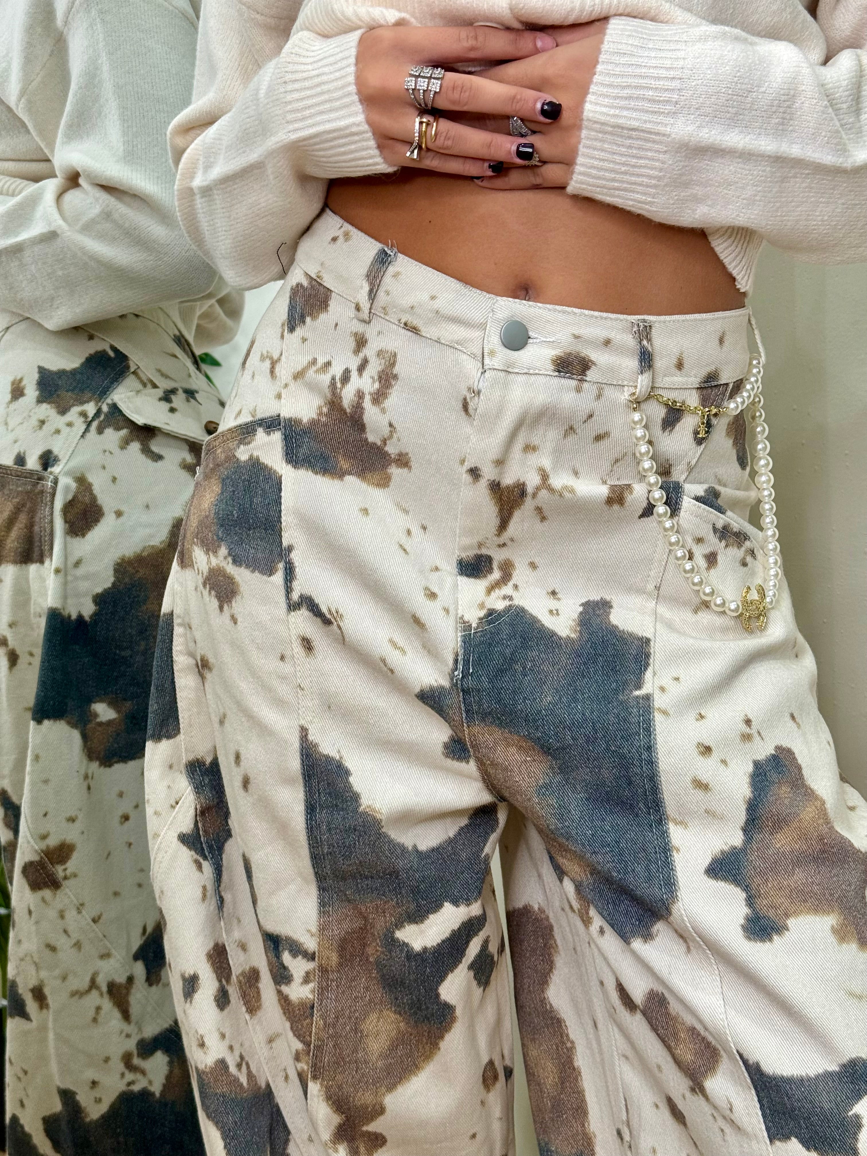 sono un’esplosione di personalità: jeans balloon fit dal taglio ampio e morbido, che stringono leggermente alla caviglia creando una silhouette rilassata ma di forte impatto. Ispirati alla texture irregolare e vivace del manto delle mucche, presentano una stampa muccata effetto denim, in una combinazione di bianco latte e denim washed grigio-blu, leggermente slavata per un look vintage ma contemporaneo.