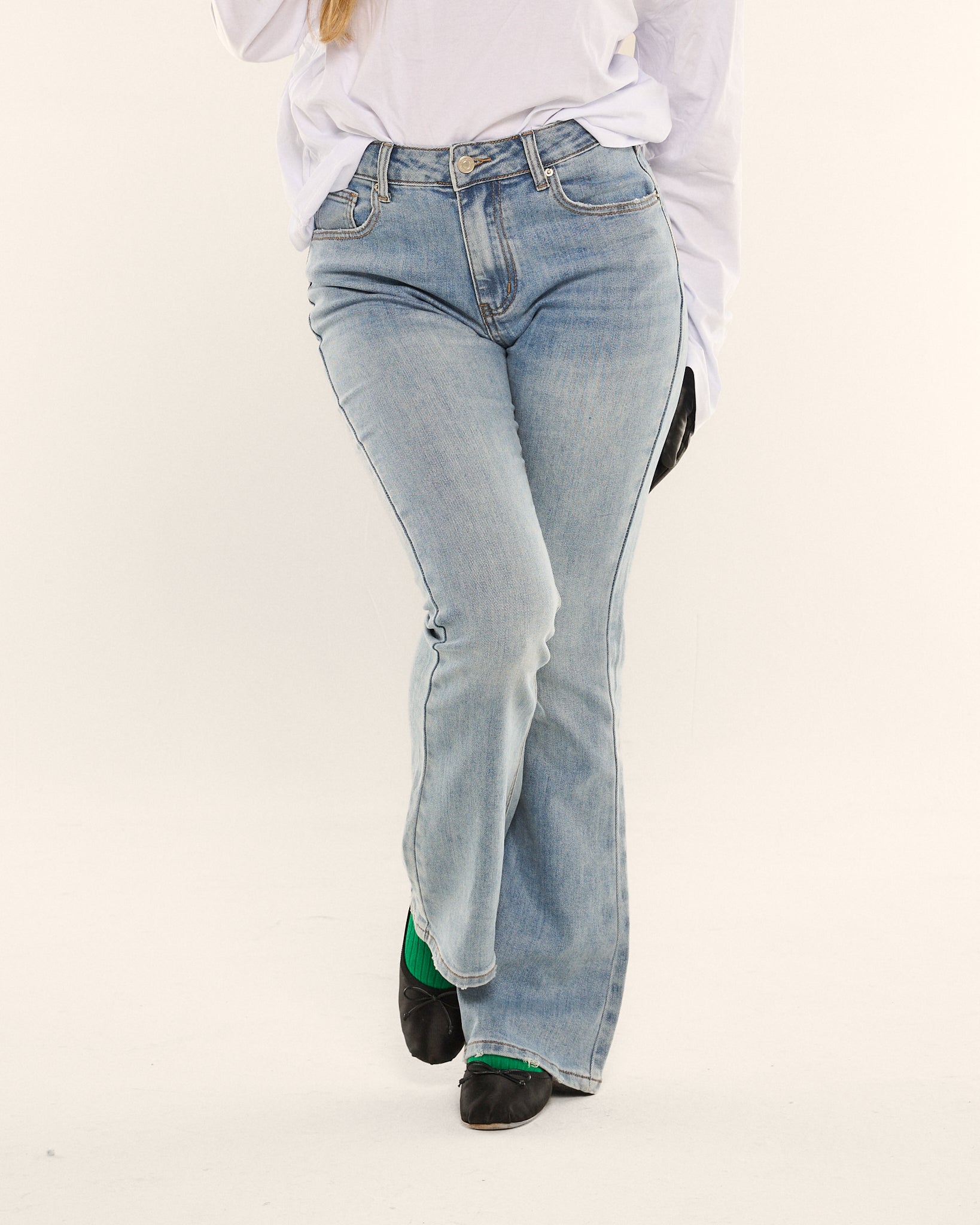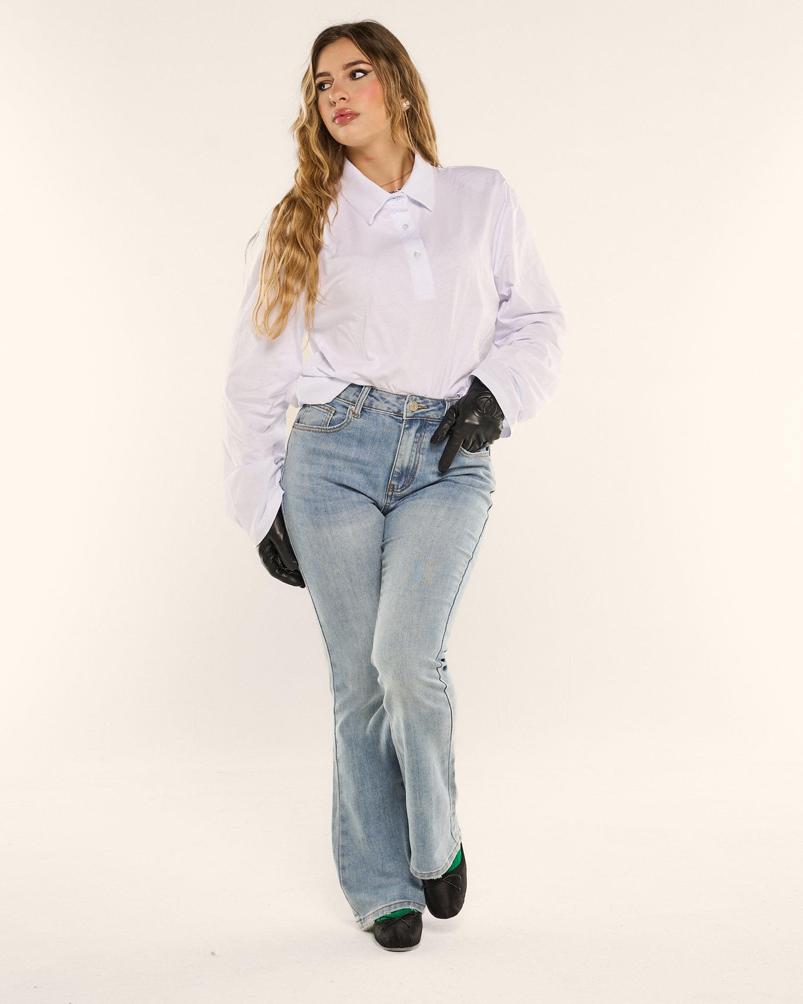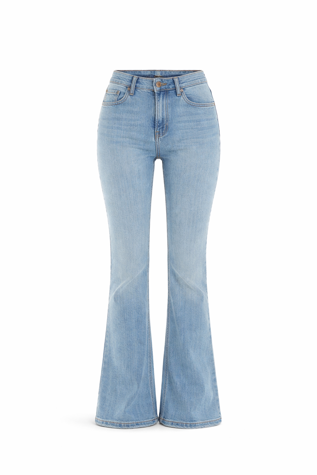 Jeans flare a vita media effetto modellante con tecnologia push-up che valorizza e solleva la silhouette. Gamba svasata dal ginocchio al fondo per un effetto slanciato e femminile. Denim elasticizzato, confortevole e avvolgente, lavaggio chiaro versatile perfetto dal giorno alla sera. Chiusura con bottone e zip, tasche frontali e posteriori. Vestibilità aderente sui fianchi, flare sul fondo.