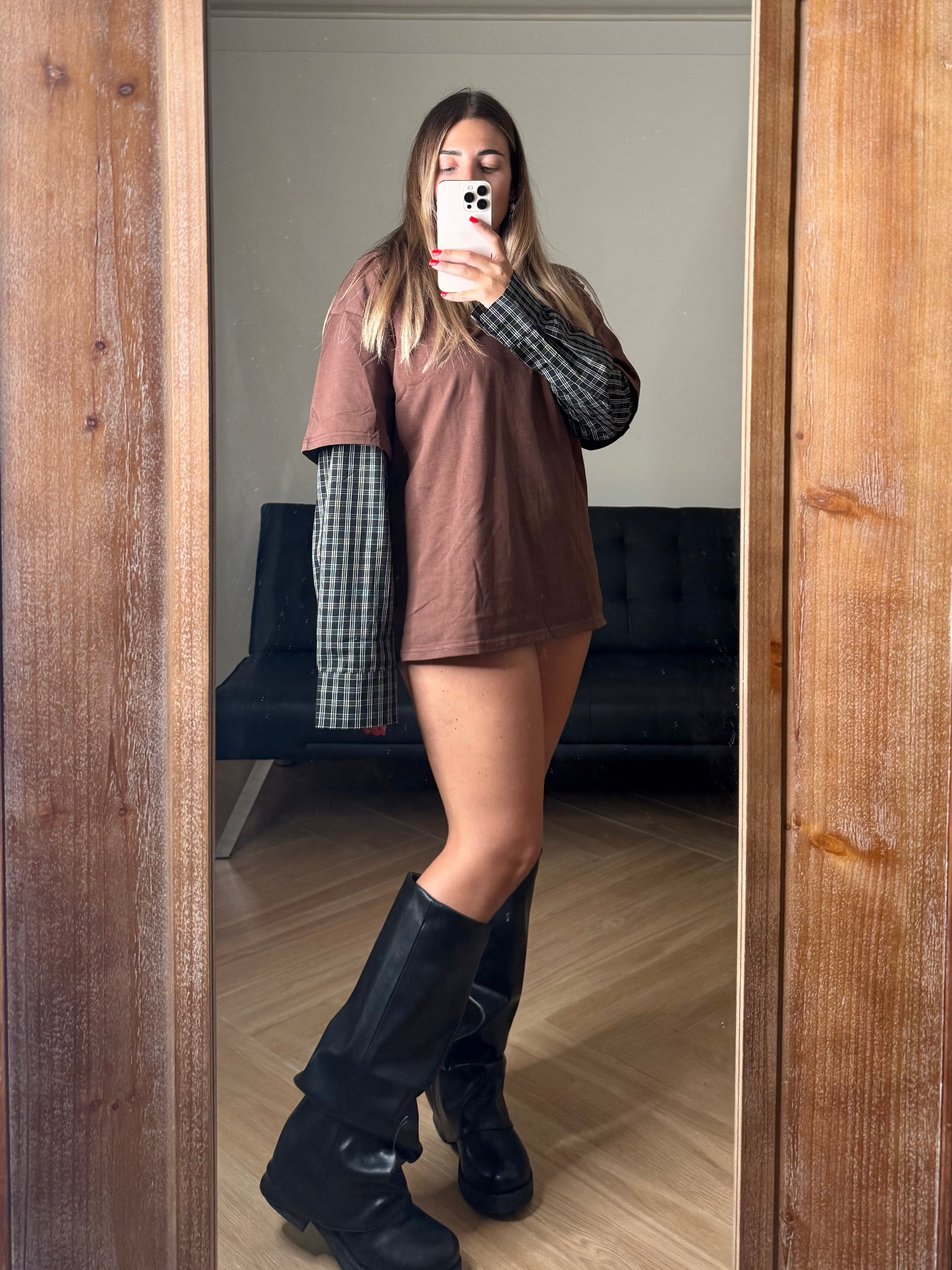 Una maglia che gioca con i contrasti: la parte superiore minimal incontra il fondo effetto camicia a quadri, creando un look a strati senza rinunciare al comfort. Realizzata in cotone morbido, unisce l’eleganza della maglia basic alla freschezza del motivo check, per un risultato contemporaneo e versatile. Perfetta da indossare con denim, gonne o pantaloni a vita alta, è il capo che trasforma la semplicità in dettaglio distintivo
