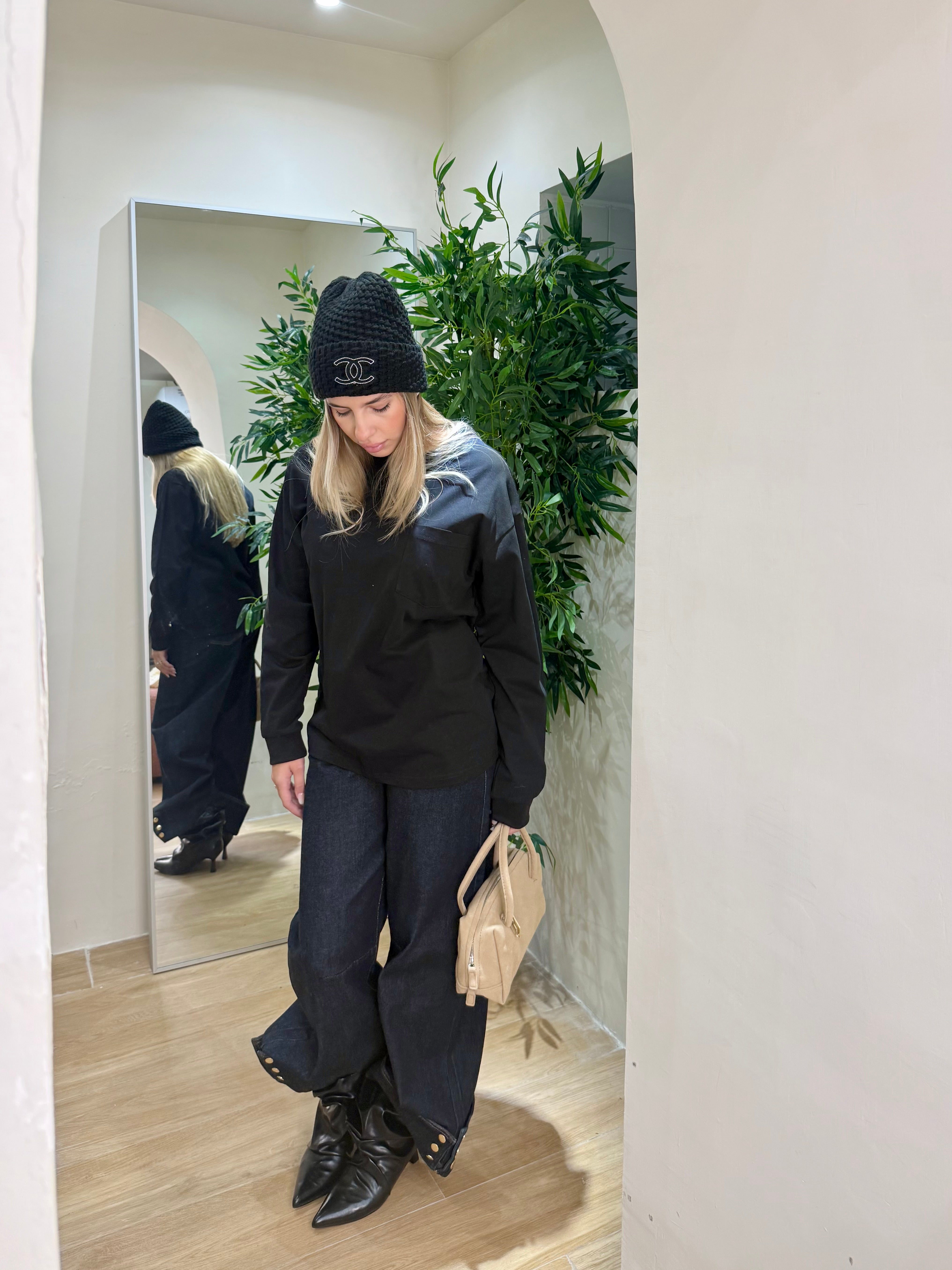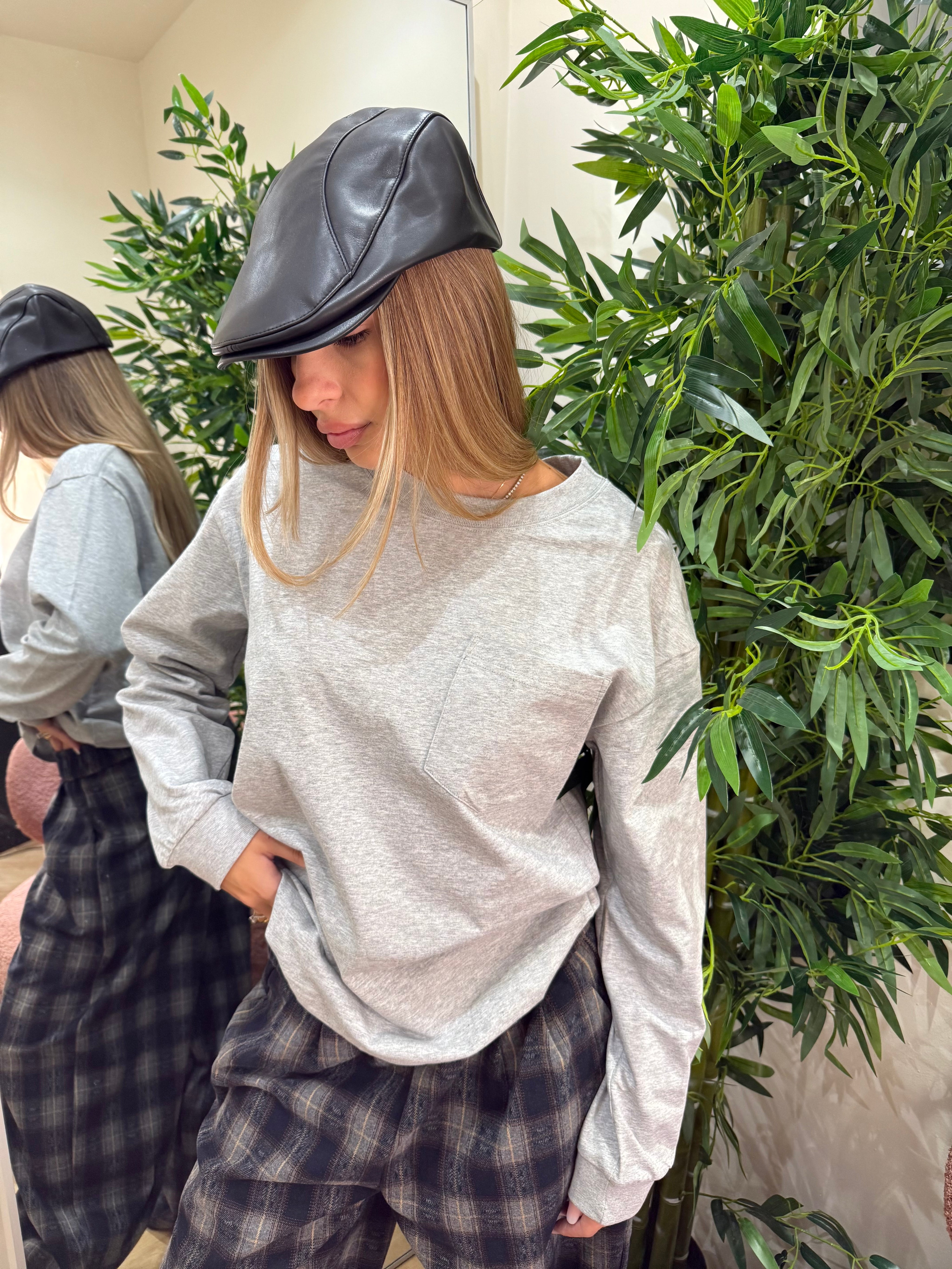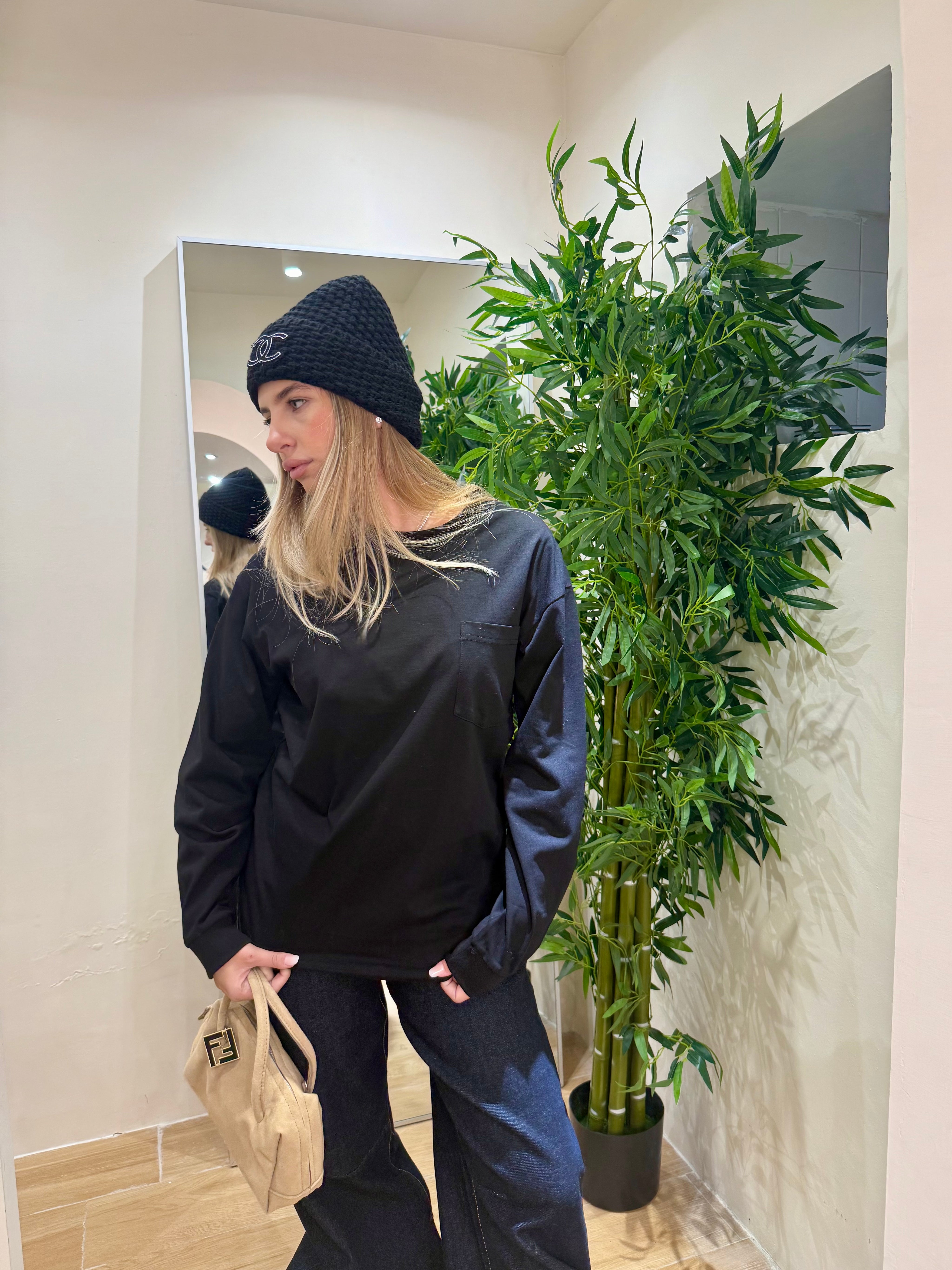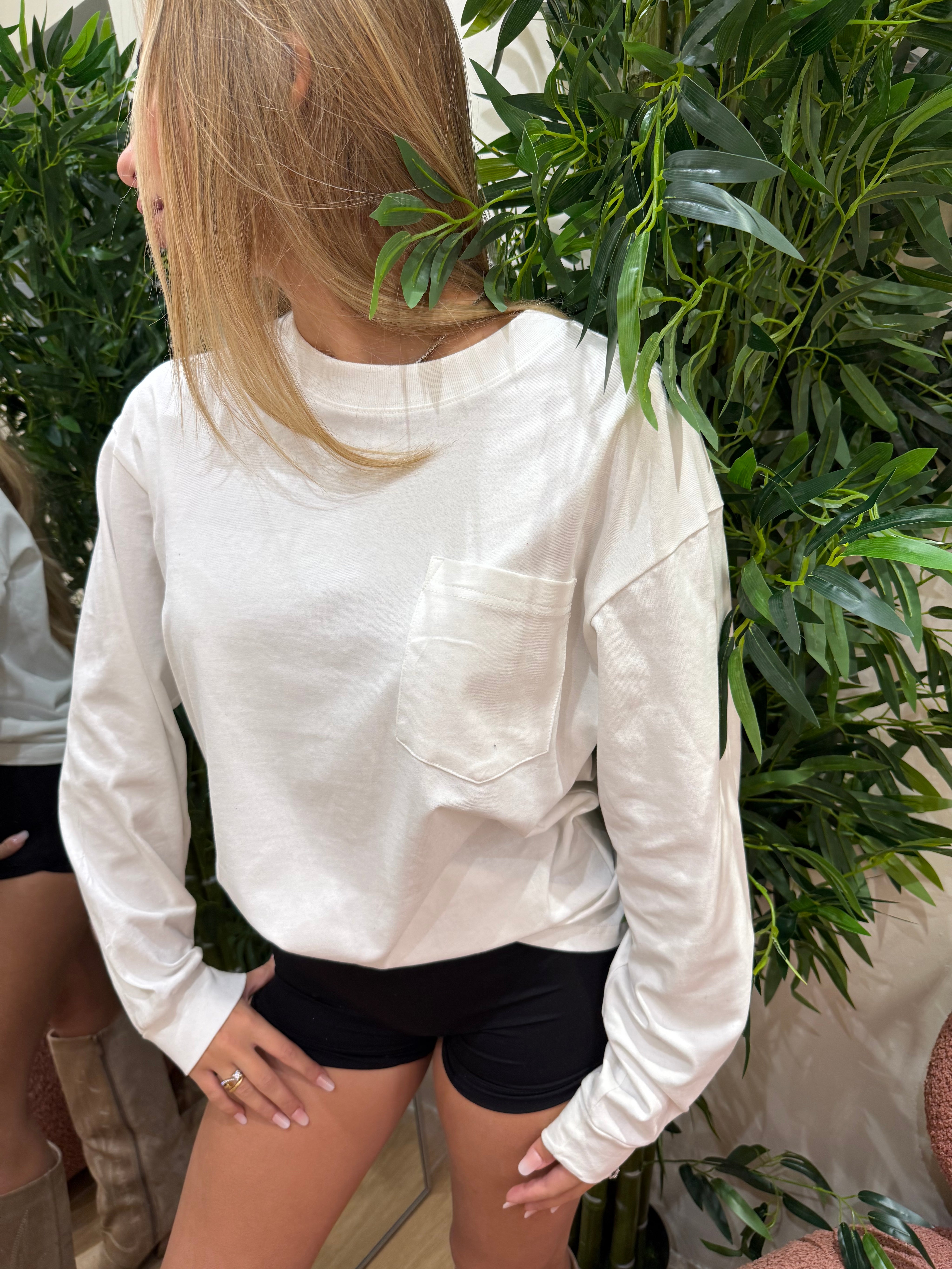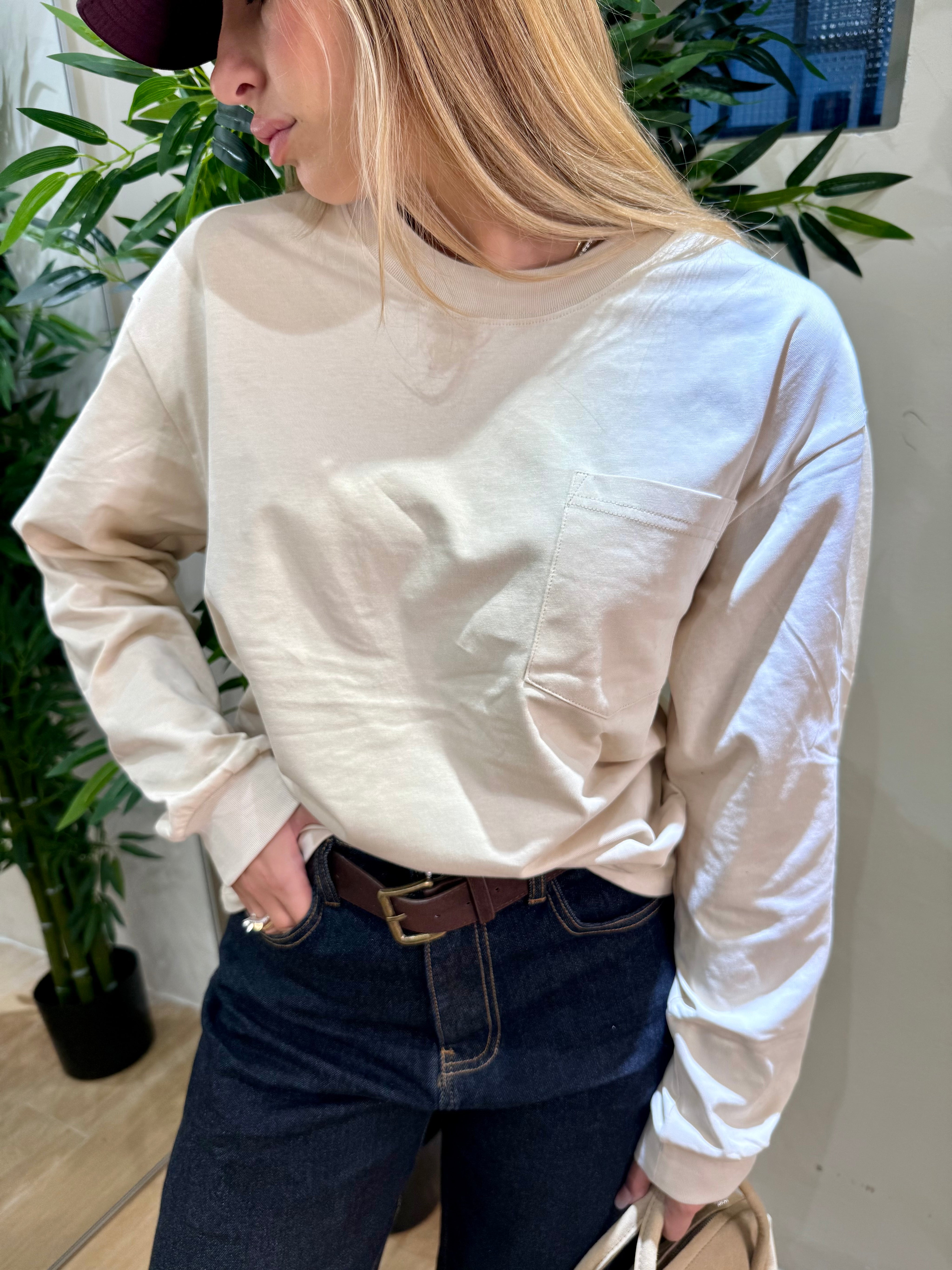 Maglia a maniche lunghe dal fit oversize, realizzata in cotone morbido e strutturato. Il design essenziale è valorizzato da due ampi tasconi laterali integrati nella cucitura, per un look pulito ma funzionale. Perfetta da indossare ogni giorno, con qualsiasi stile.