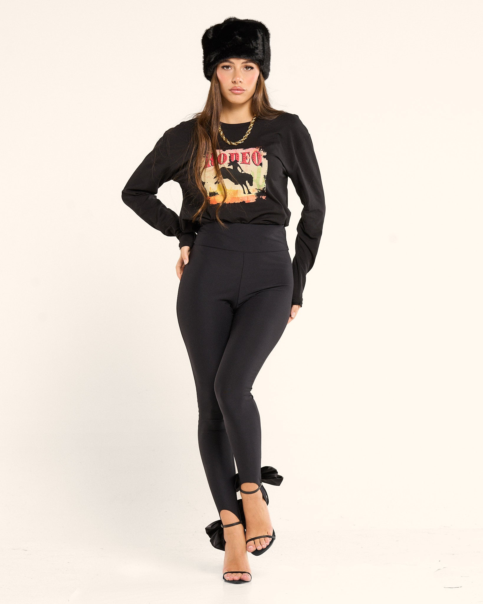T-shirt a maniche lunghe in cotone soft-touch, con stampa vintage Rodeo effetto vissuto. Il modello leggermente over e la texture morbida la rendono un capo casual ma curato, perfetto da indossare dentro pantaloni a vita alta o sotto blazer oversize per un look country-chic con twist moderno. Un richiamo all’anima western, reinterpretata in chiave urbana e sofisticata.