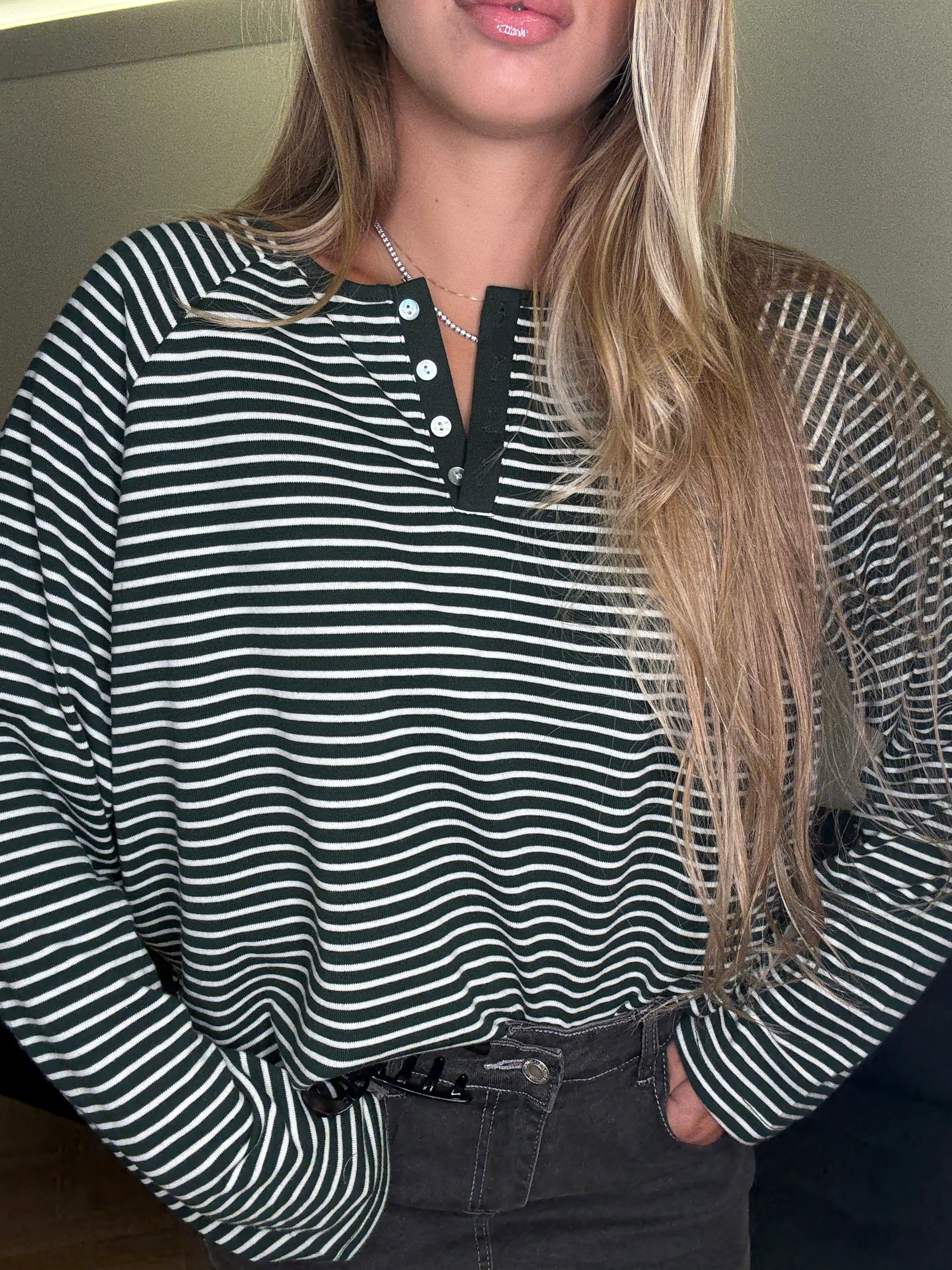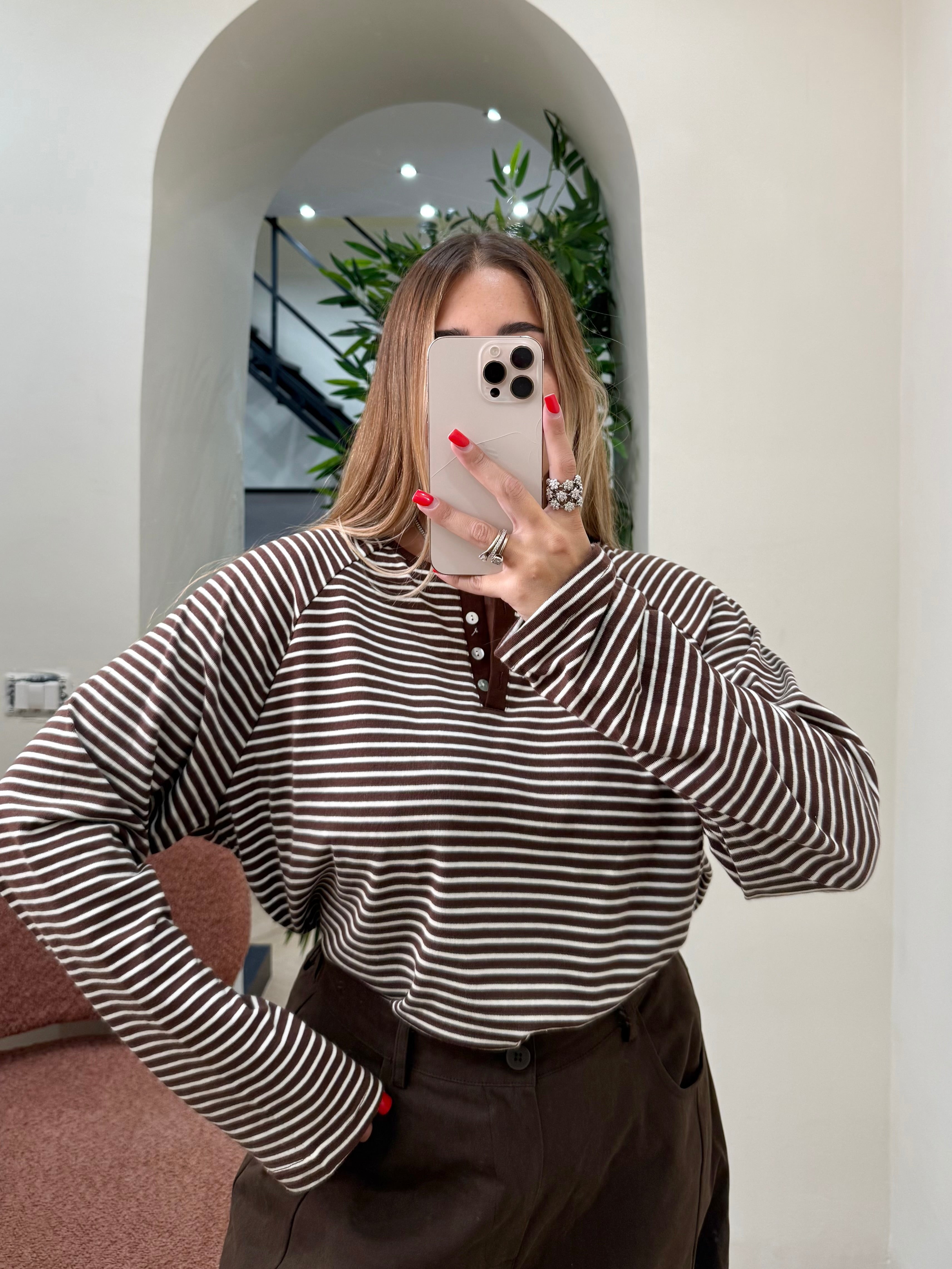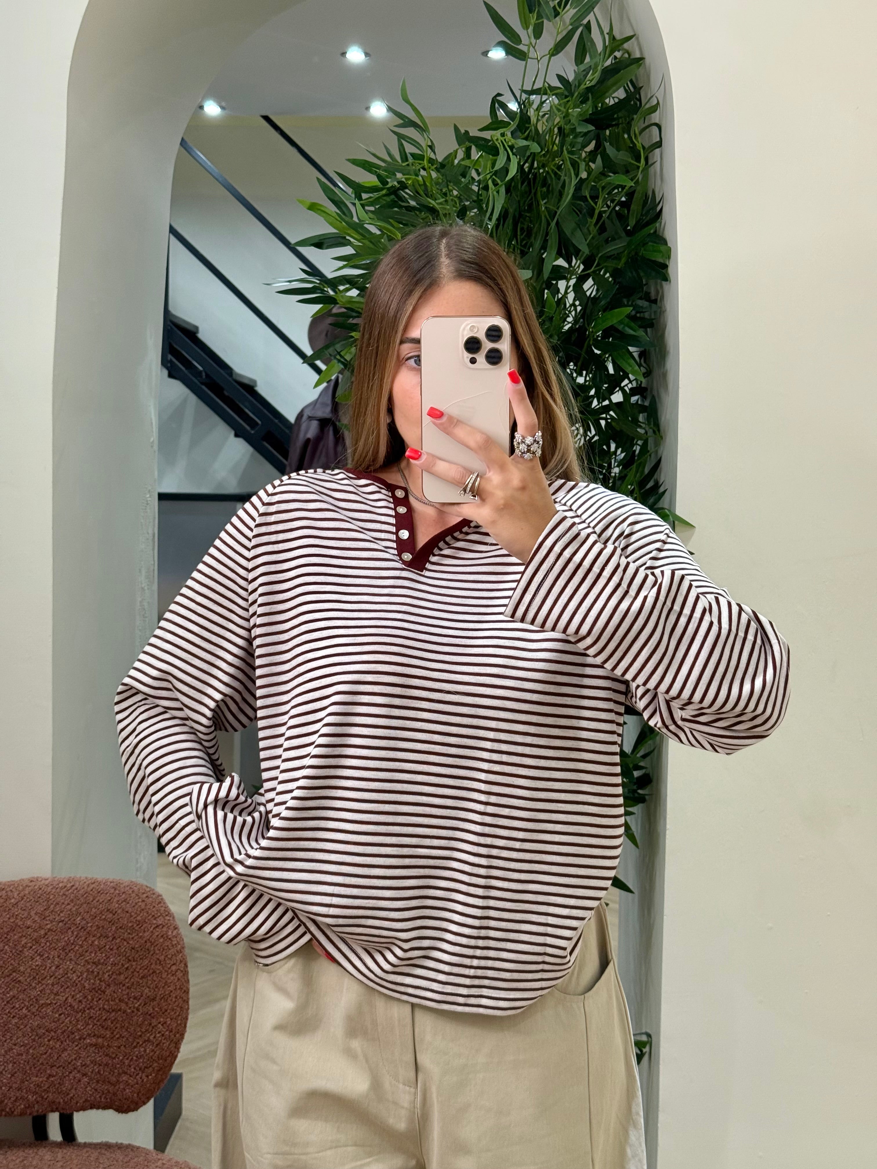 Maglia in cotone caldo ma leggero, perfetta per la mezza stagione. Il design leggermente oversize regala comfort e uno stile rilassato, mentre le maniche extra lunghe aggiungono un tocco moderno e ricercato. Il collo serafino con tre bottoncini completa il look, rendendo questa maglia a righe un capo versatile e sempre di tendenza, facile da abbinare sia in outfit casual che più raffinati.