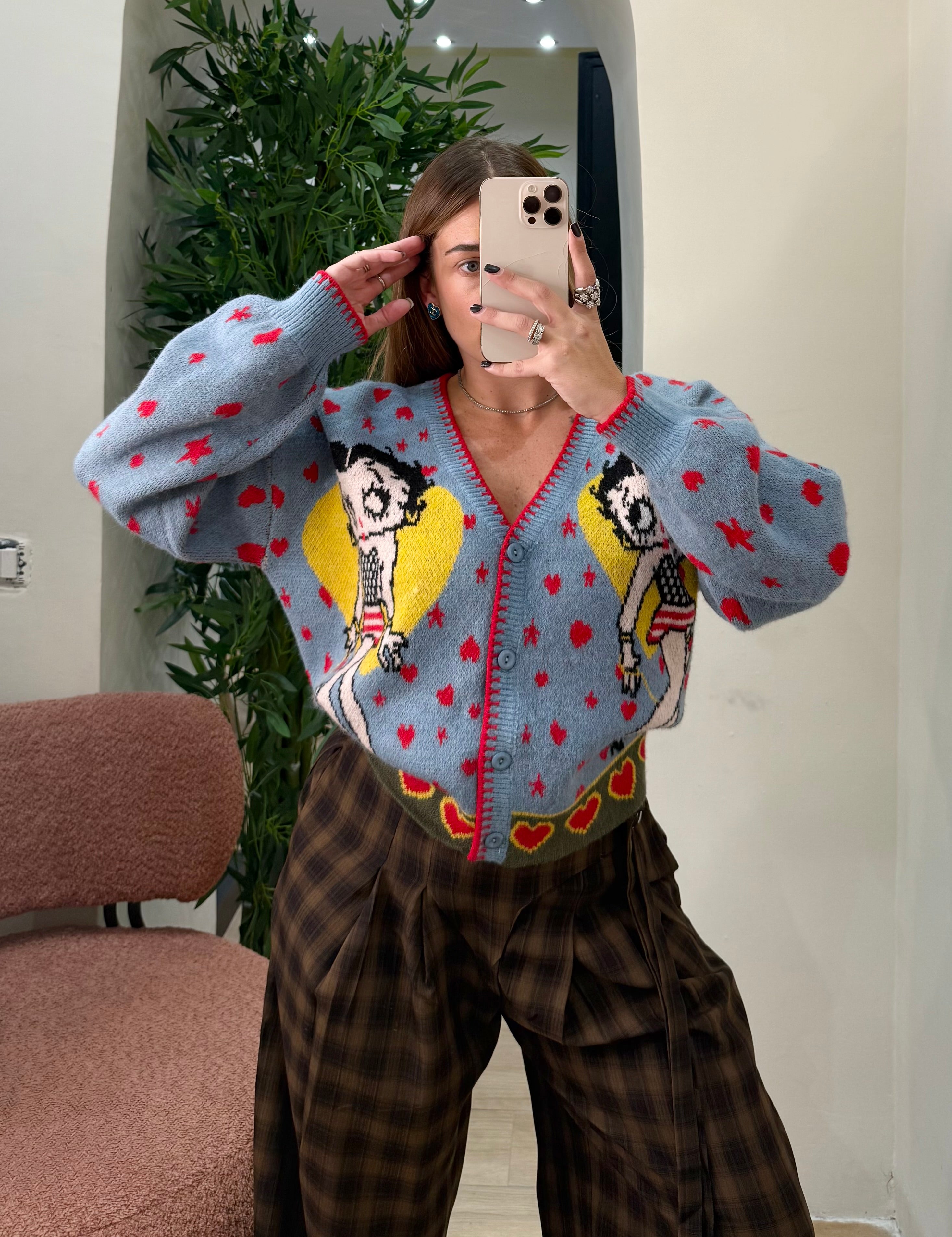 In un delicato azzurro pastello, questo maglione dal peso consistente unisce comfort e originalità grazie alla sua fantasia esclusiva con la mitica Betty Boop e il suo inseparabile cagnolino Pudgy, circondati da cuori romantici che raccontano una storia di affetto e personalità.
