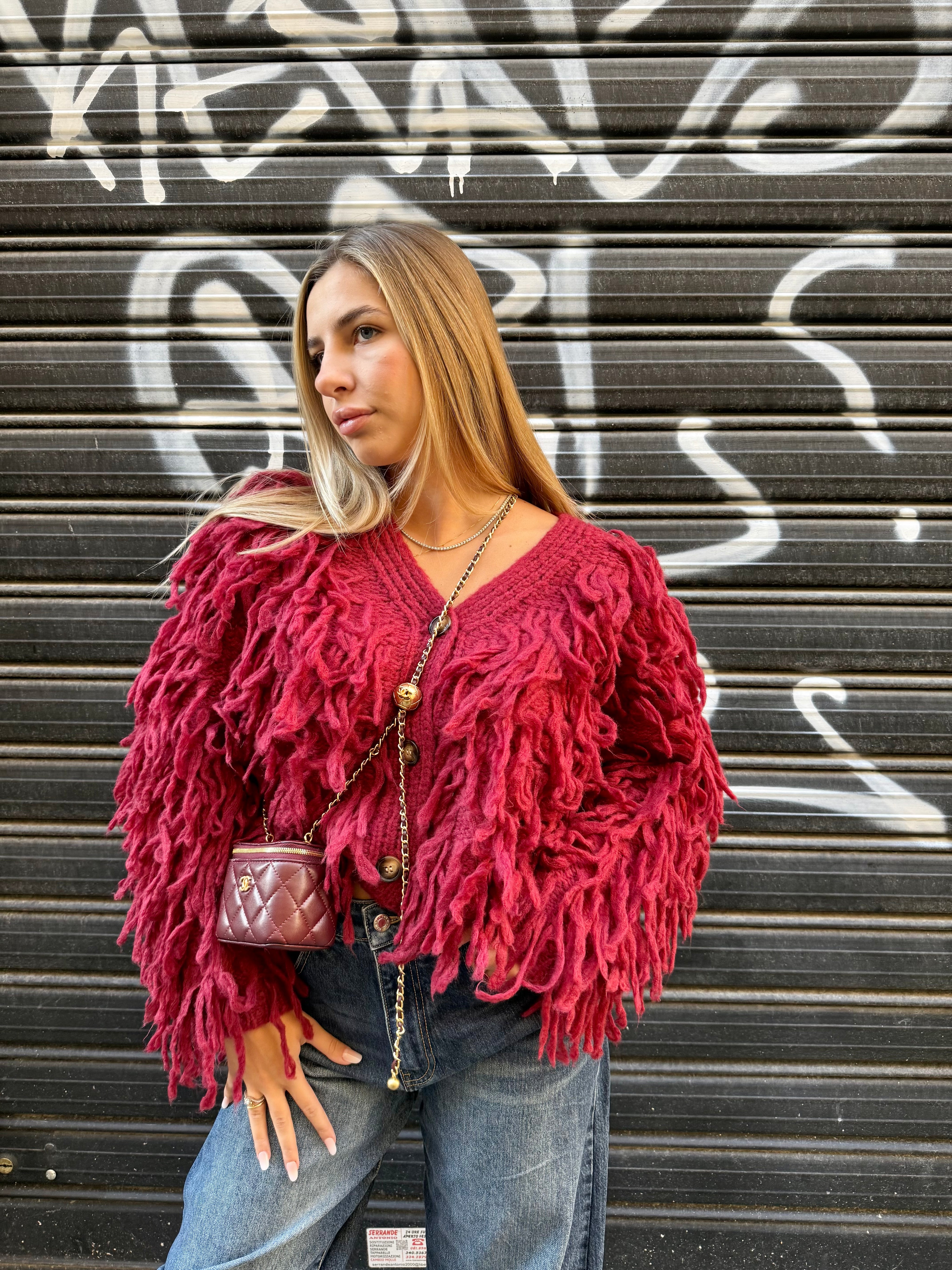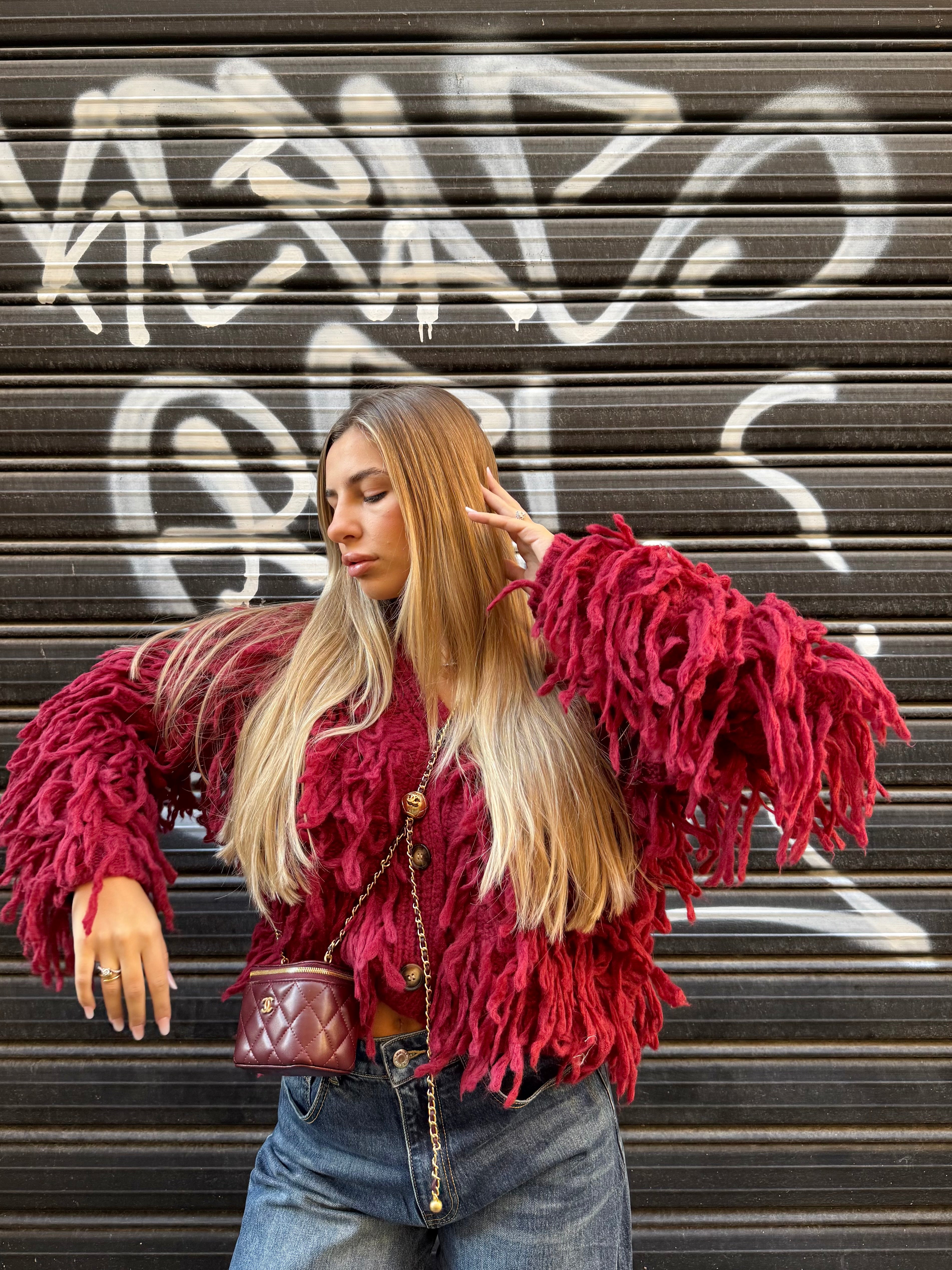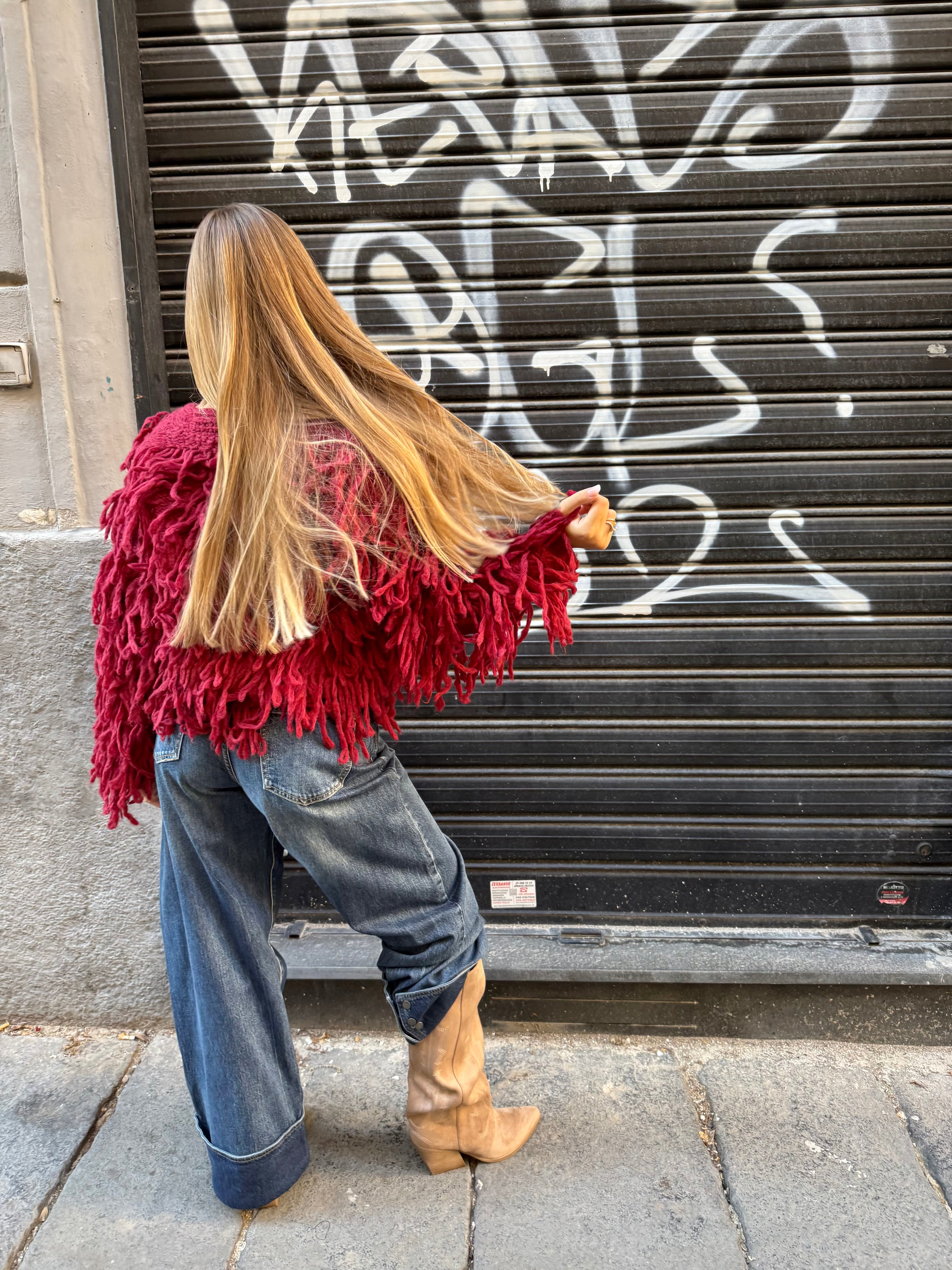 Maglione over dal design destrutturato e materico, realizzato con una combinazione di tessuti sfilacciati e texture contrastanti. I bottoni marroni in evidenza aggiungono un tocco artigianale a un capo volutamente esagerato, caldo e ricco di personalità. Ruvo non segue le regole: le riscrive con stile e sostanza.