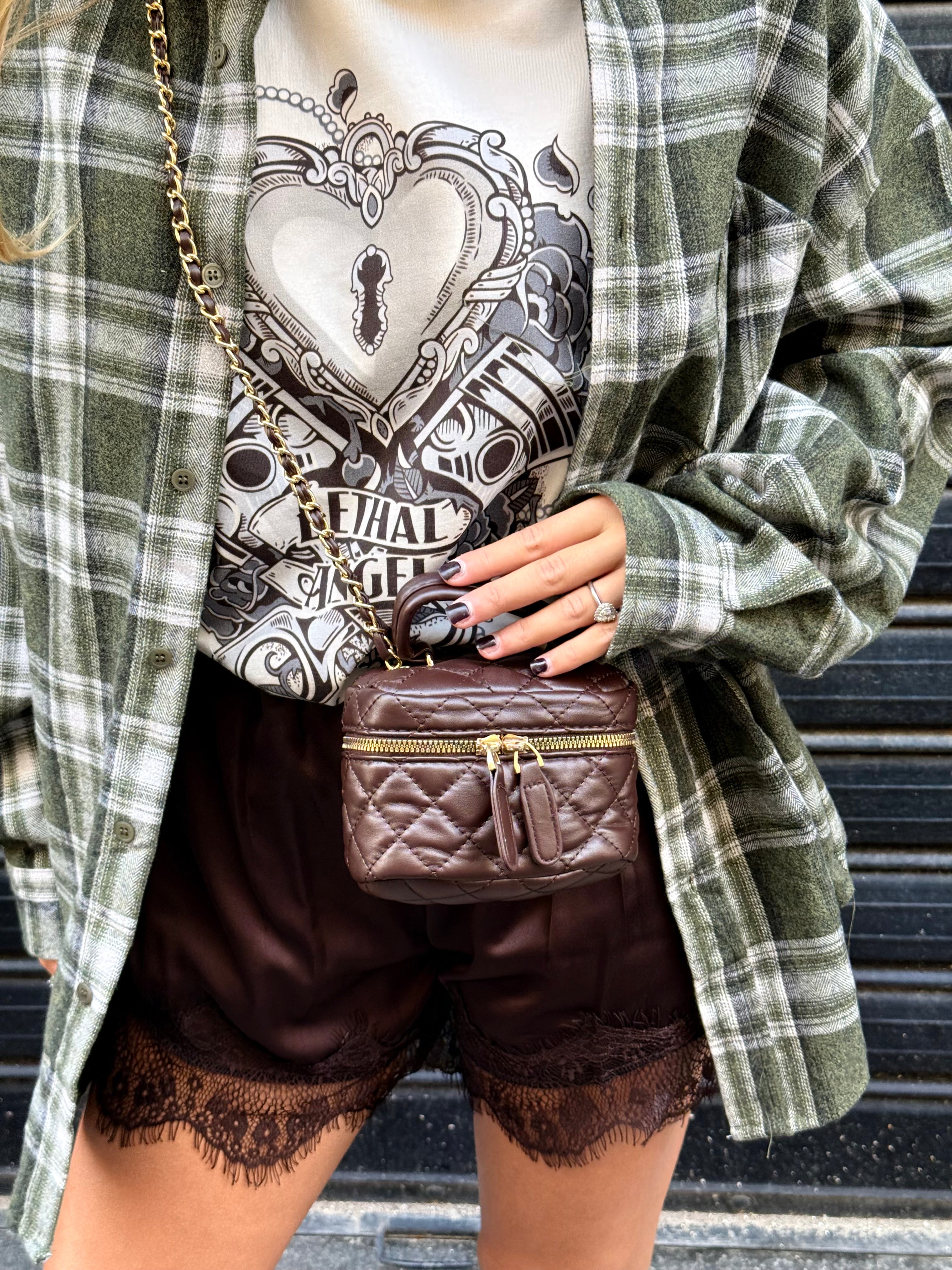 Micro Bag secchiello piccolo e trapuntato, con catenina oro e manicotto per portarla a mano o a spalla. Un accessorio sofisticato e versatile, perfetto per completare look minimal chic o outfit più ricercati.