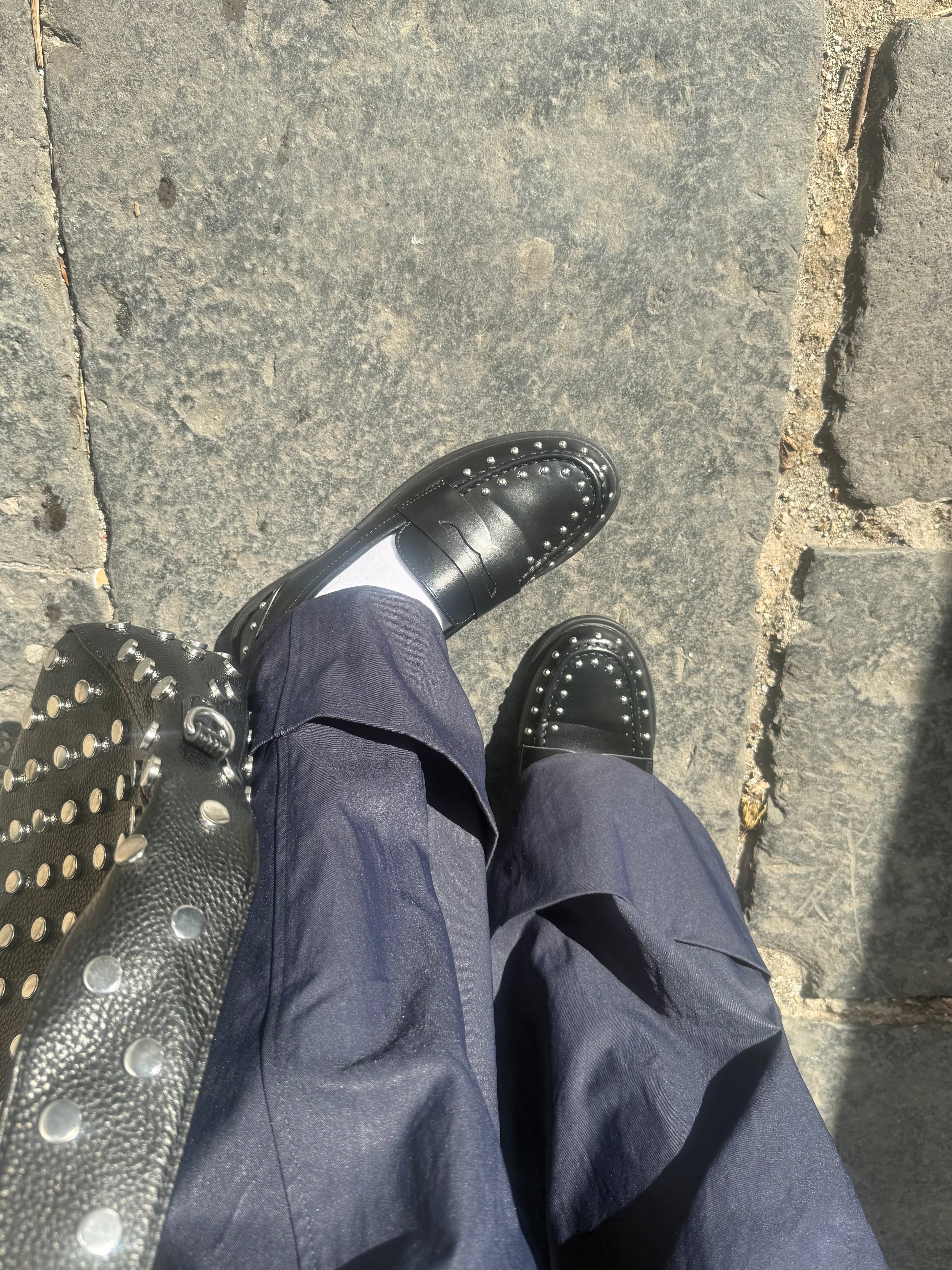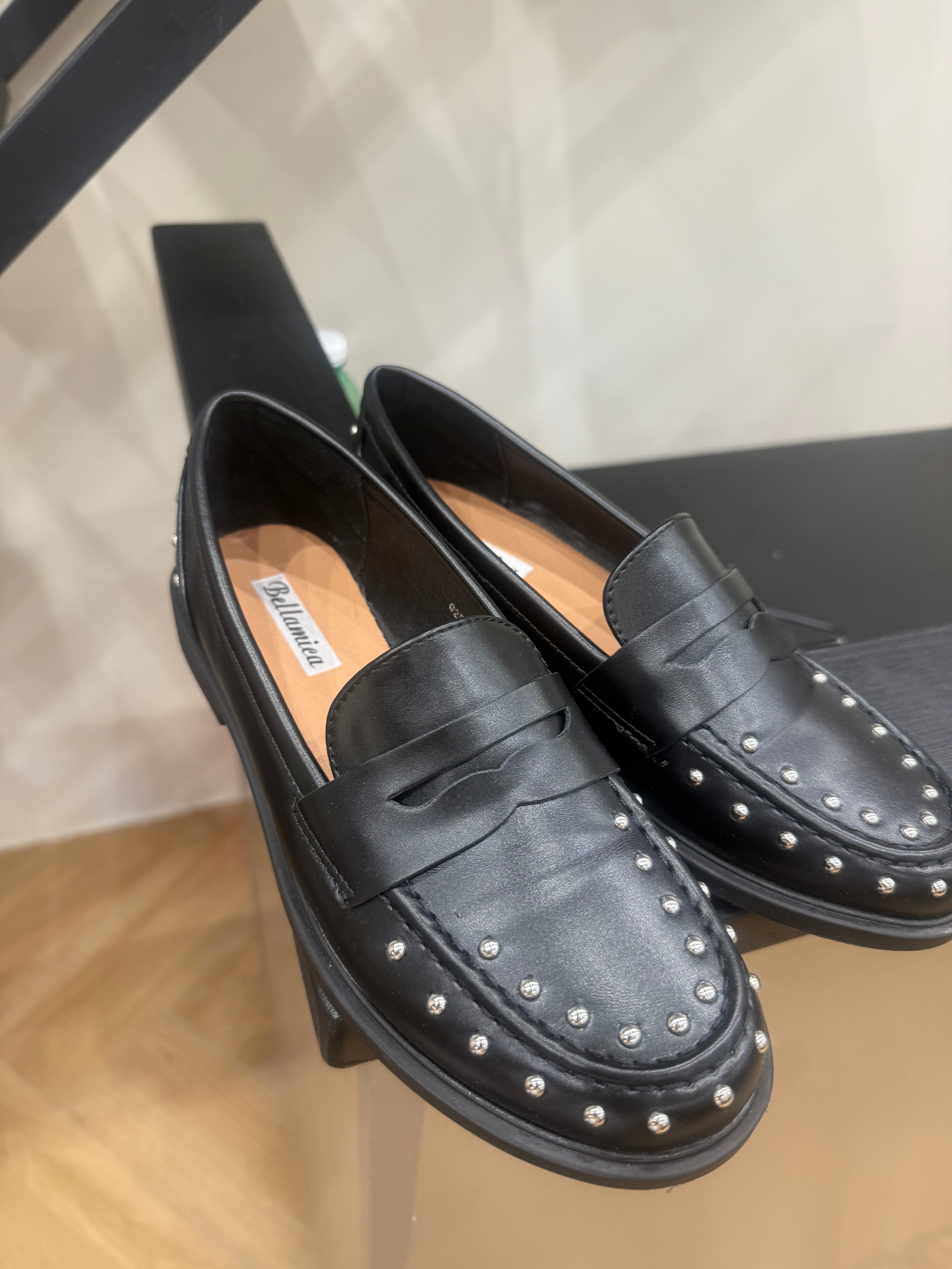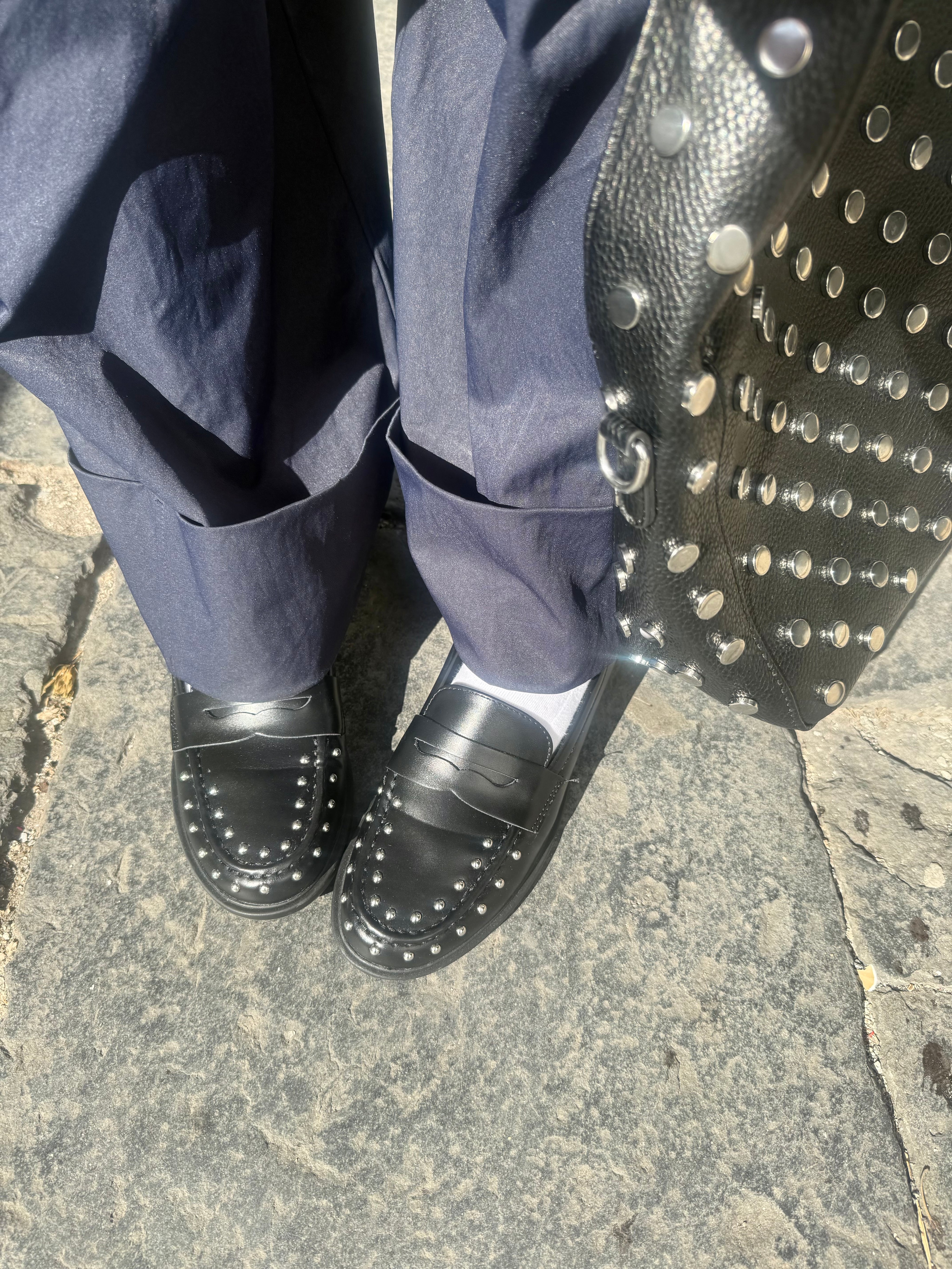 Il dettaglio delle mini borchie lungo i bordi aggiunge un tocco moderno e audace senza appesantire la silhouette, rendendo il mocassino adatto sia a look casual che più eleganti.