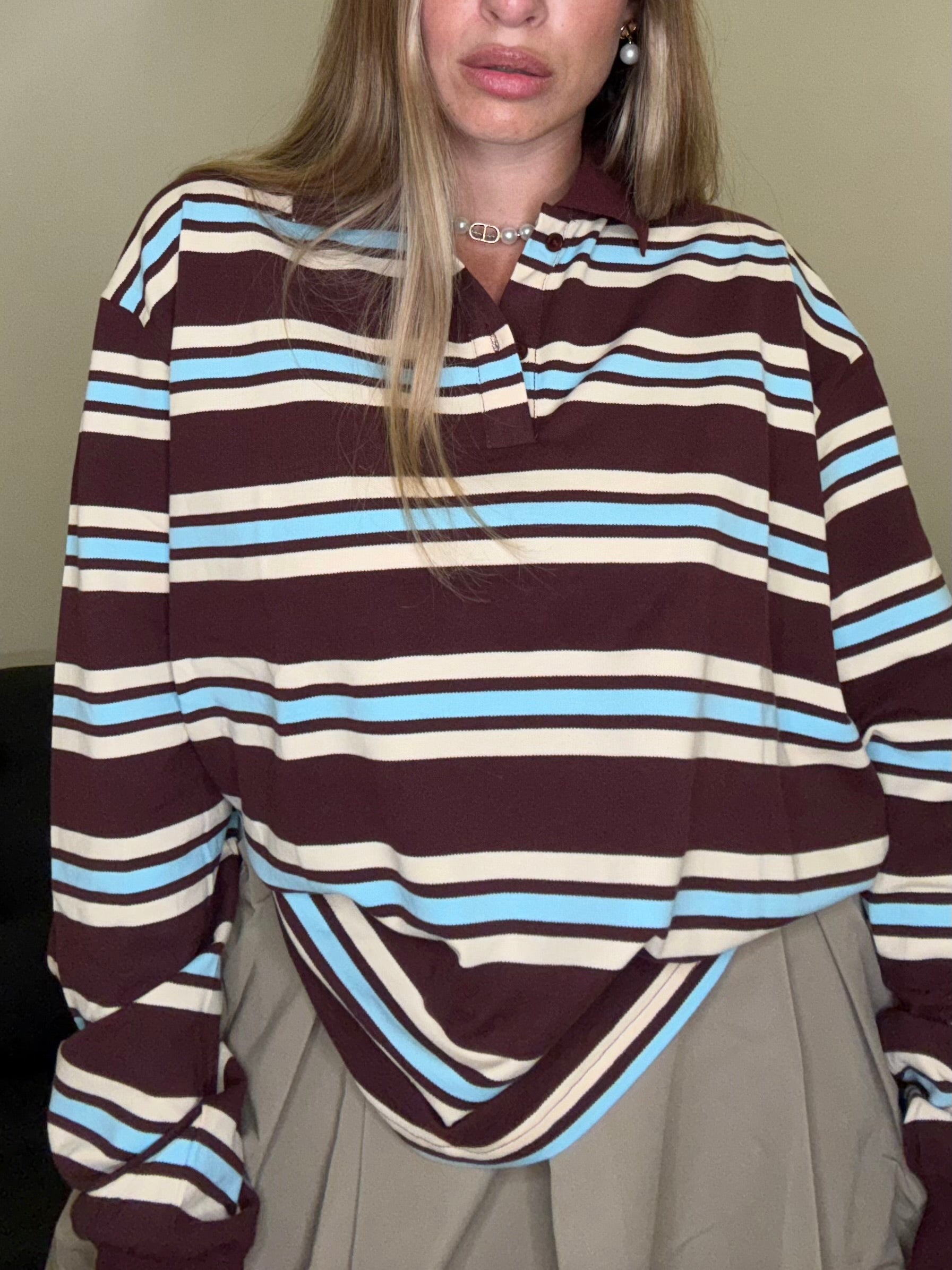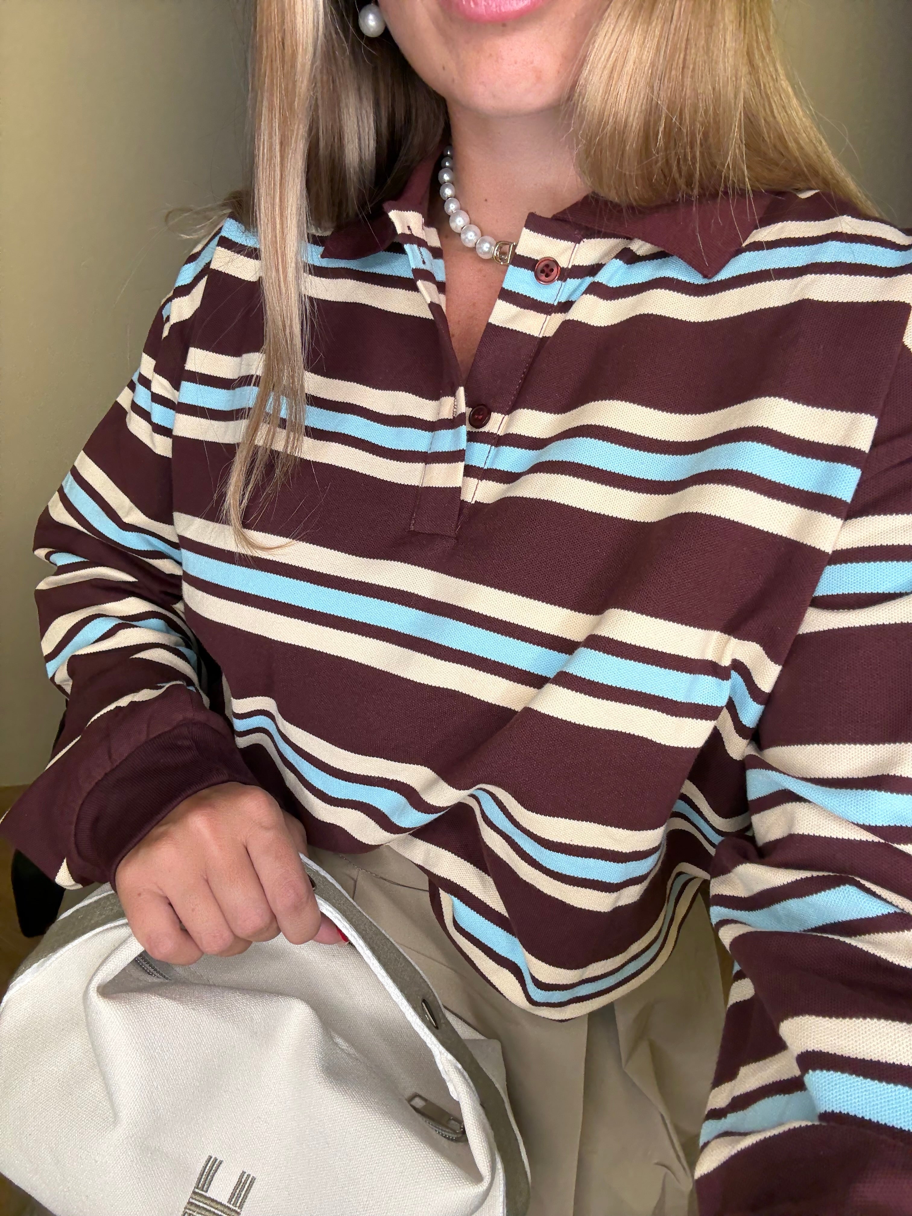 Una polo che unisce semplicità e femminilità: realizzata in tessuto leggero e morbido, presenta un motivo a righe elegante e sofisticato. Il taglio leggermente sagomato valorizza la silhouette, mentre i dettagli curati richiamano lo stile contemporaneo delle collezioni Miu Miu. Perfetta da abbinare a jeans, gonne o pantaloni a vita alta per un look chic e versatile, ideale per ogni occasione casual o smart-casual