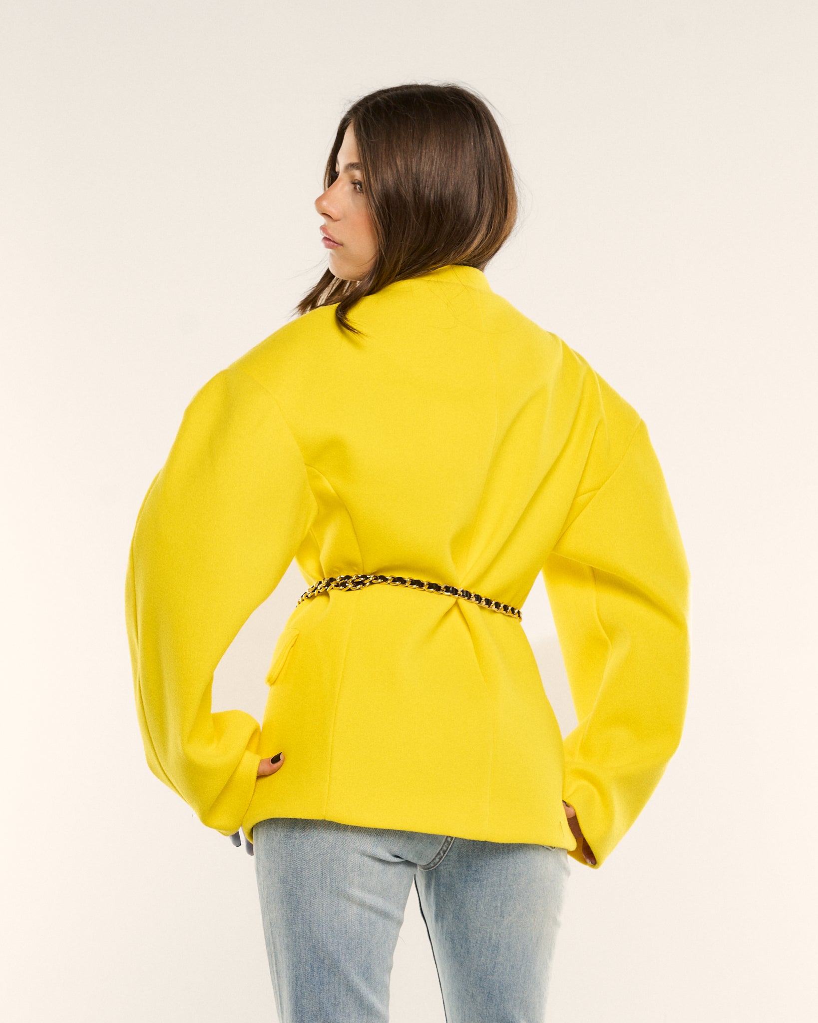 Blazer strutturato color giallo intenso dal taglio pulito e contemporaneo. Linea leggermente over con tasche frontali e design minimal. Un capo protagonista, perfetto per dare luce e carattere anche al look più semplice.
