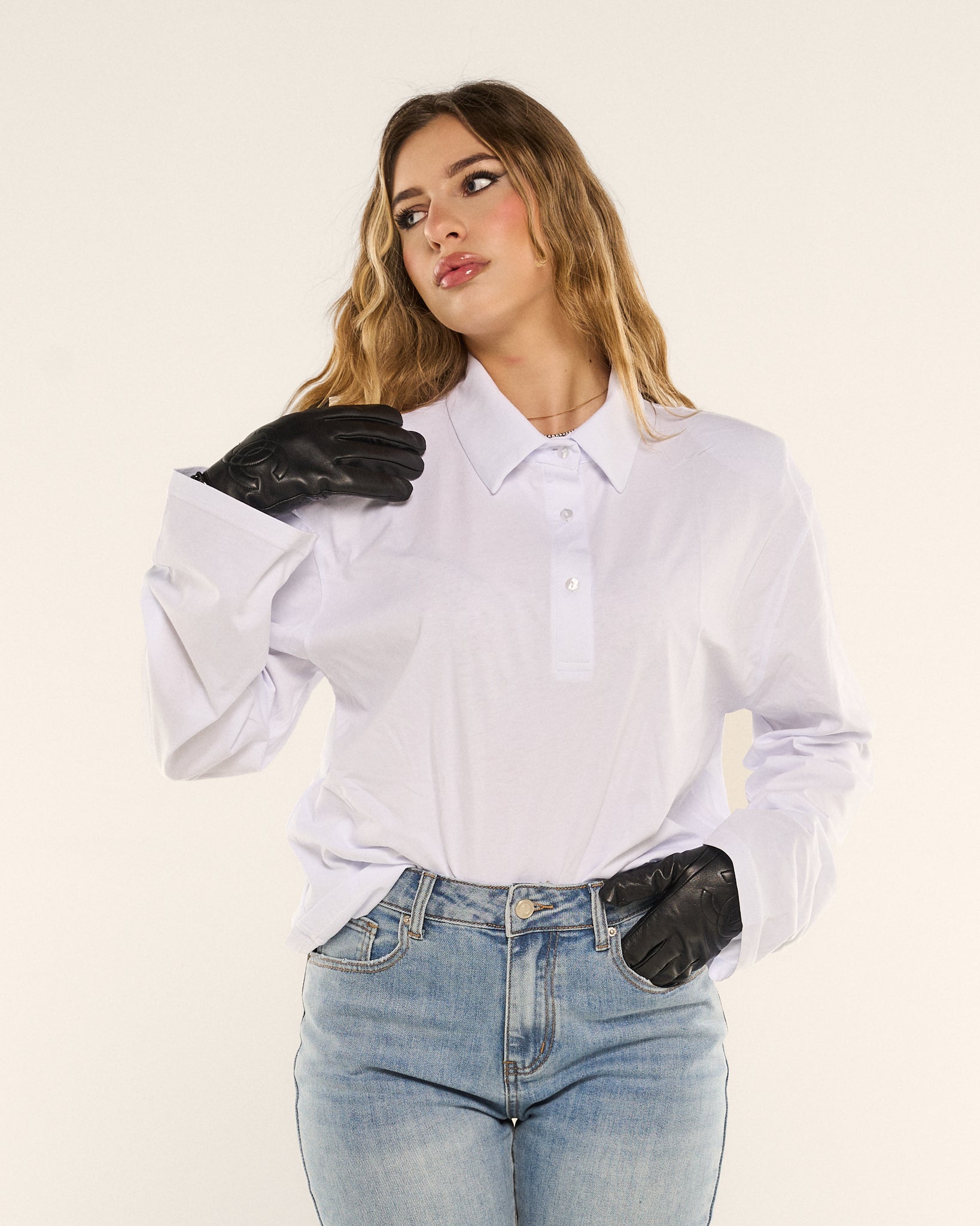 Polo bianca dal design pulito con colletto classico e lunghezza leggermente cropped. Basica ma raffinata, ideale da abbinare a blazer o pantaloni a vita alta.