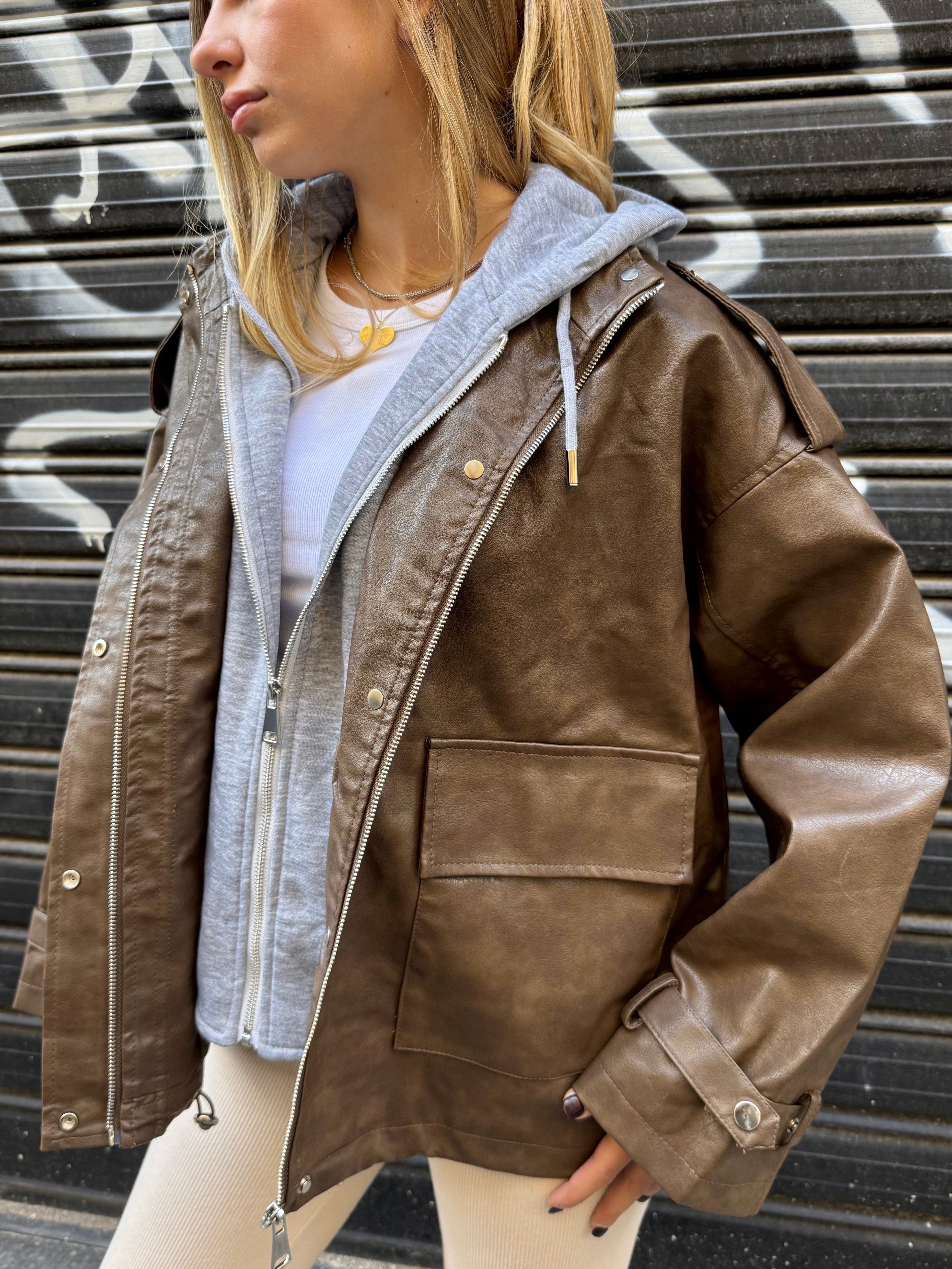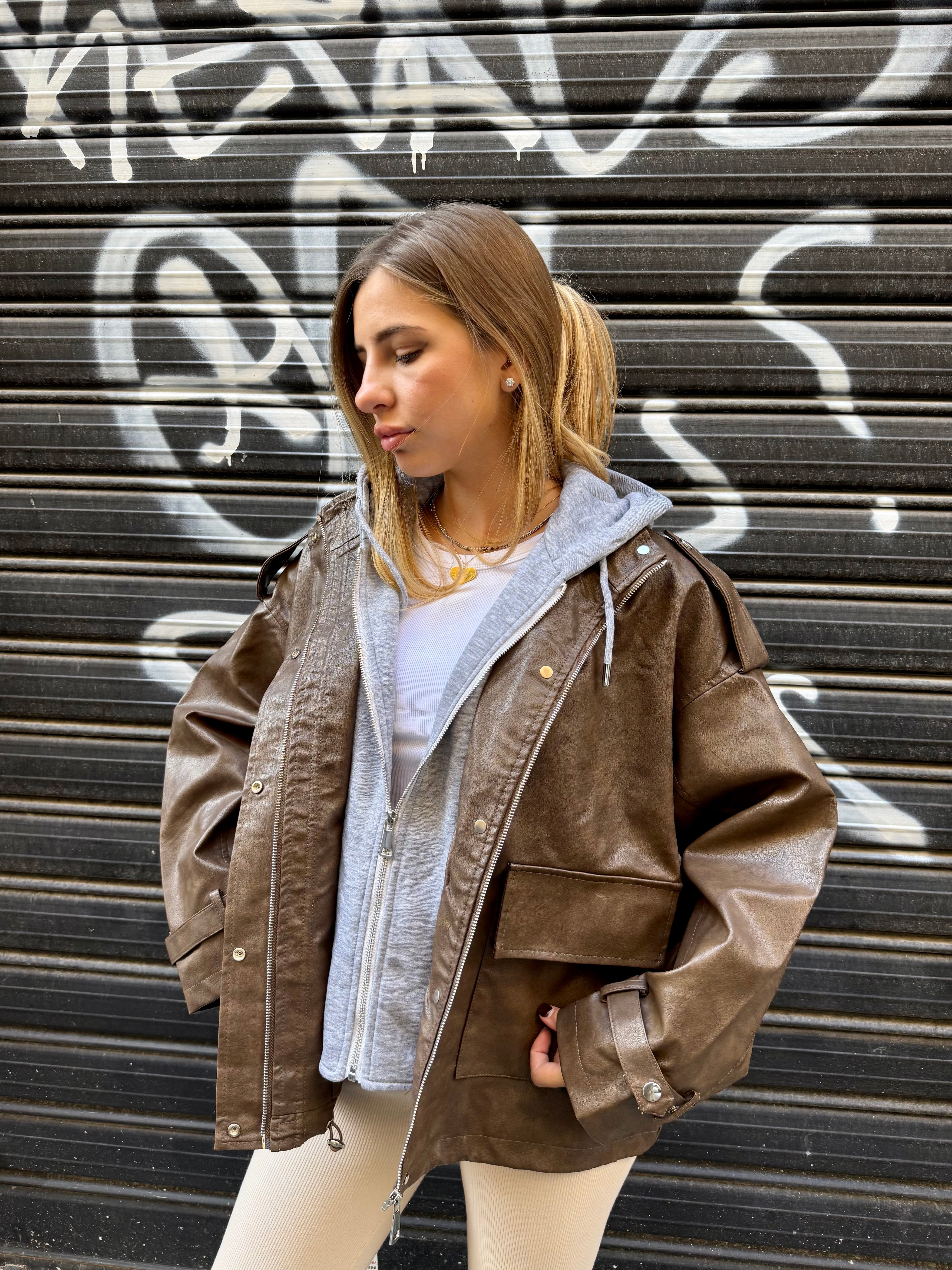 Biker oversize in pelle con cappuccio interno pelpato assemblato, che unisce grinta e comfort in un unico capo. Linee moderne e silhouette ampia per un look urbano e contemporaneo, perfetto da indossare sopra outfit minimal o layering streetwear.