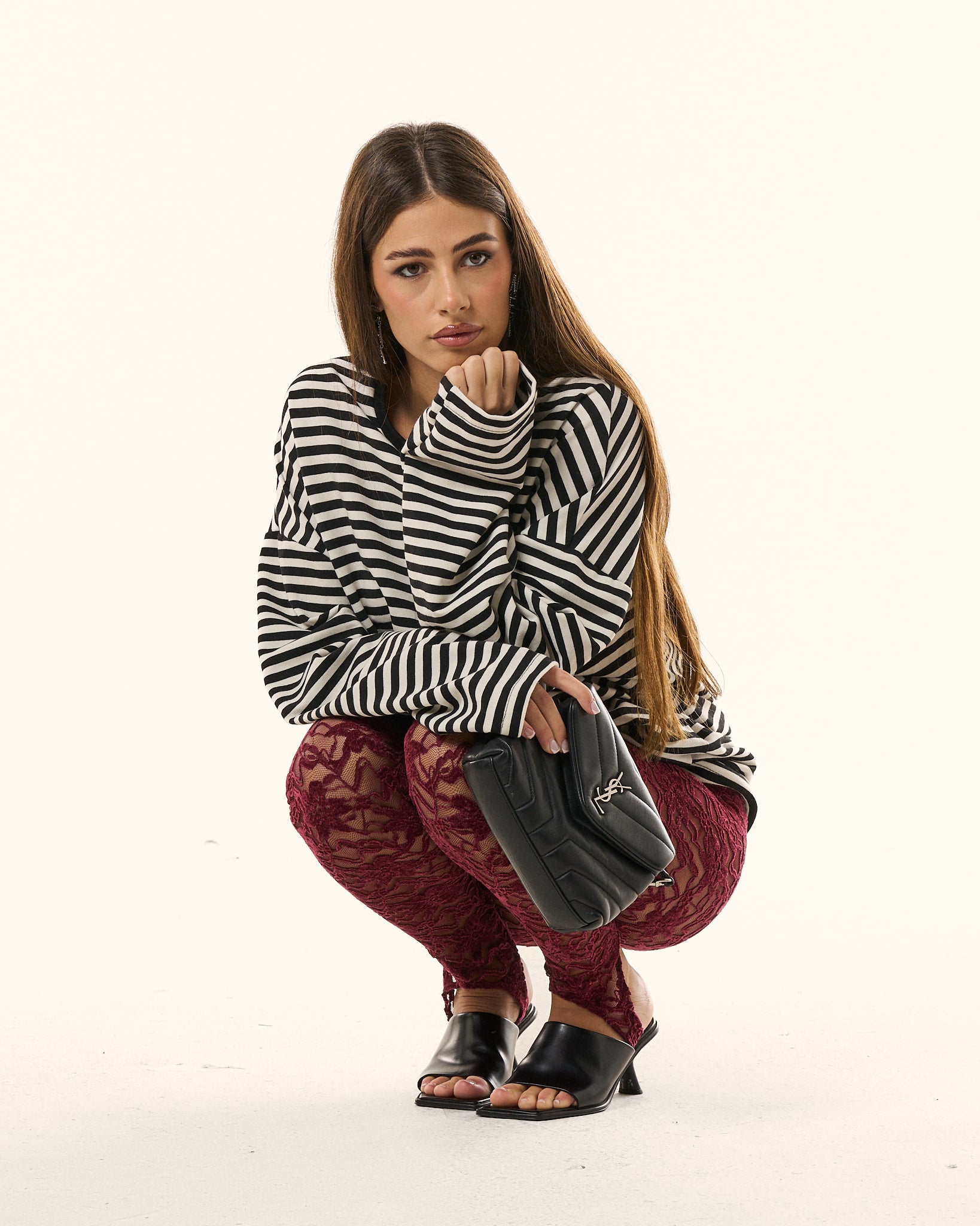la felpa extra oversize che unisce comfort assoluto e un’estetica effortless francese. Realizzata in tessuto felpato morbido, presenta una vestibilità ampia e rilassata, con maniche lunghe e spalla scesa per un effetto ultra cozy. Le righe bicolor donano un tocco classico e cool, perfetto da mixare con leggings, denim o gonne per look casual-chic.