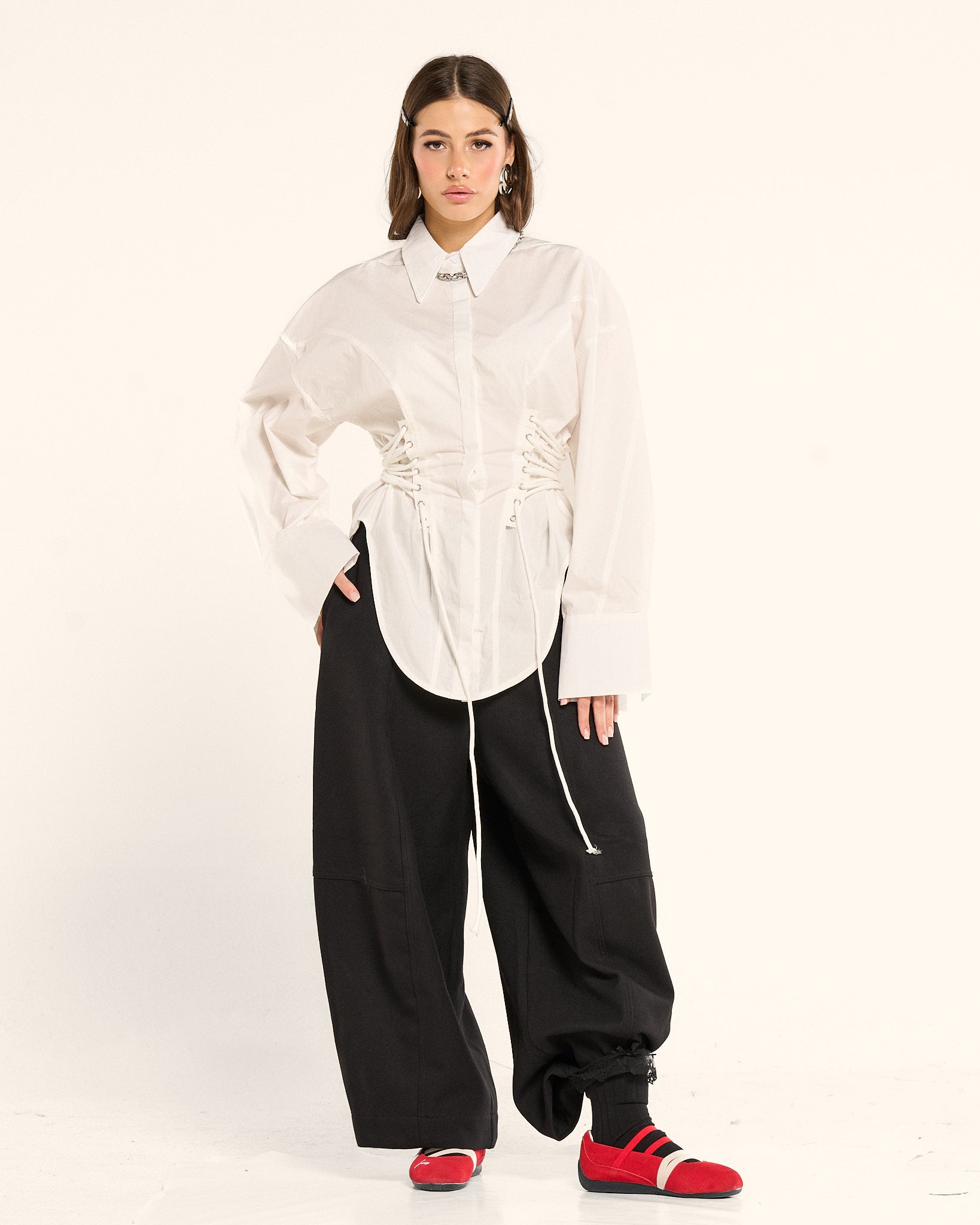 Pantalone over in lana rasata, dalla linea morbida e destrutturata. Il taglio ampio e il fondo leggermente raccolto creano un volume contemporaneo e sofisticato, perfetto per look minimal ma d’impatto. La texture calda e compatta della lana dona eleganza e comfort, rendendolo ideale per la stagione fredda. Da abbinare a camicie crop o blazer sartoriali per un contrasto moderno tra rigore e relax.
