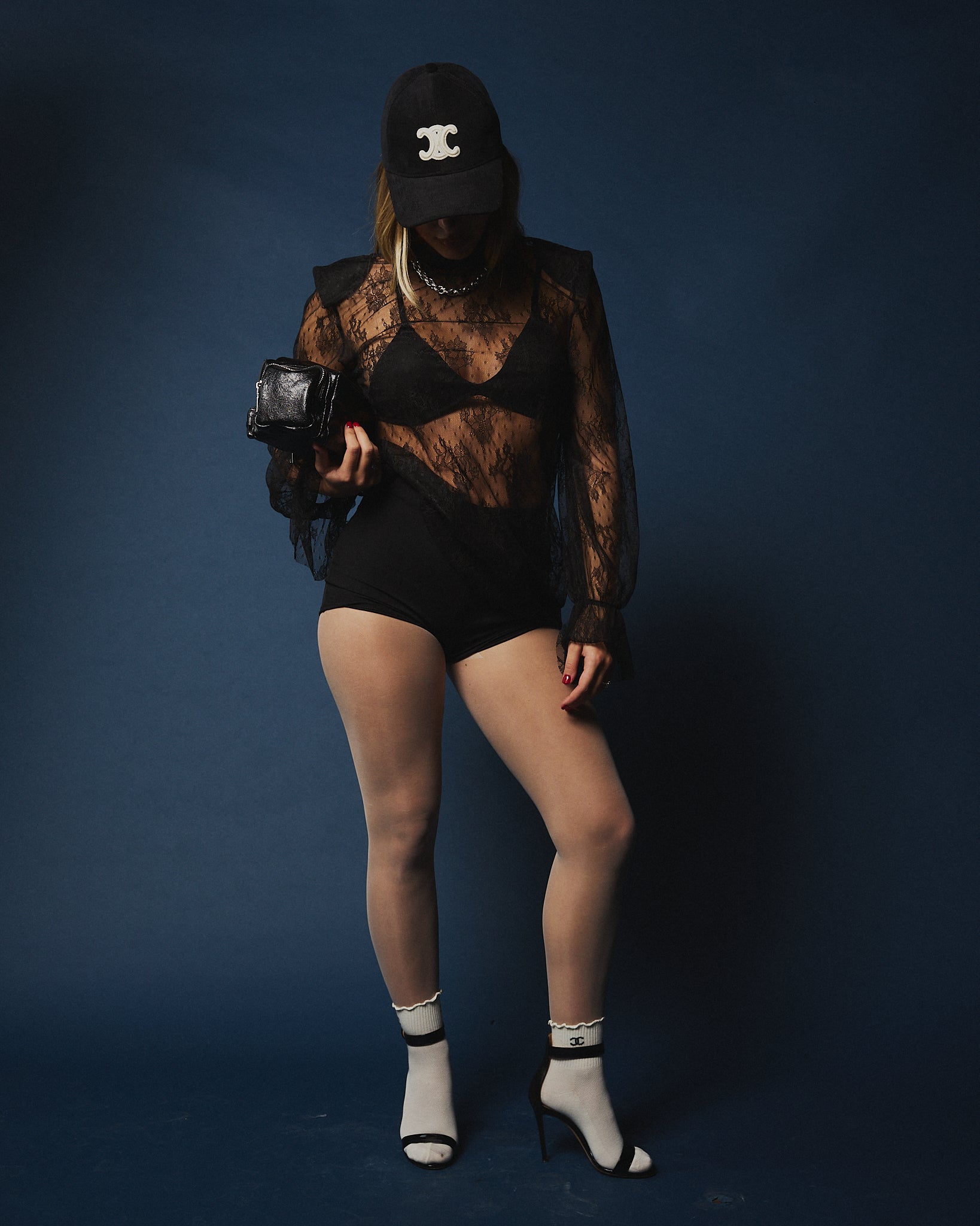 Completa il set una casacca in pizzo trasparente, dal design raffinato e sensuale, caratterizzata da spalline strutturate, polsini stretti con volant e dettagli delicati che donano movimento e femminilità.
