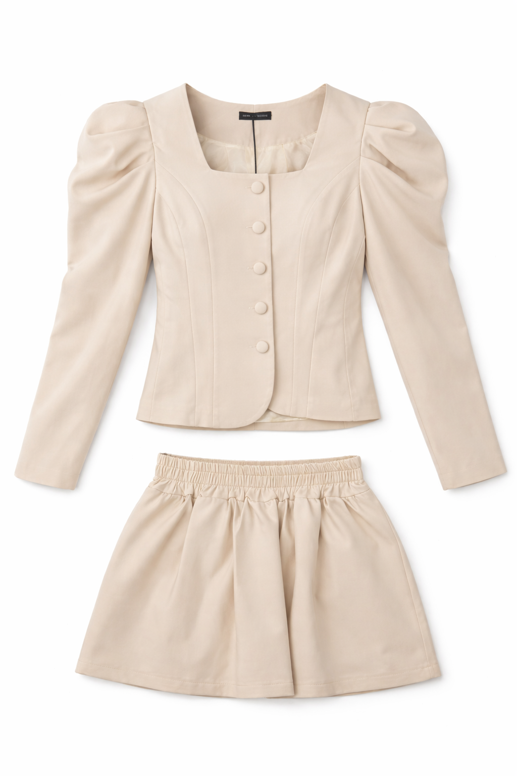 Completo due pezzi color beige composto da giacca strutturata con spalle leggere e bottoni rivestiti, abbinata a mini skirt morbida in vita. Femminile, raffinato e perfetto per look eleganti da giorno o serate minimal chic.