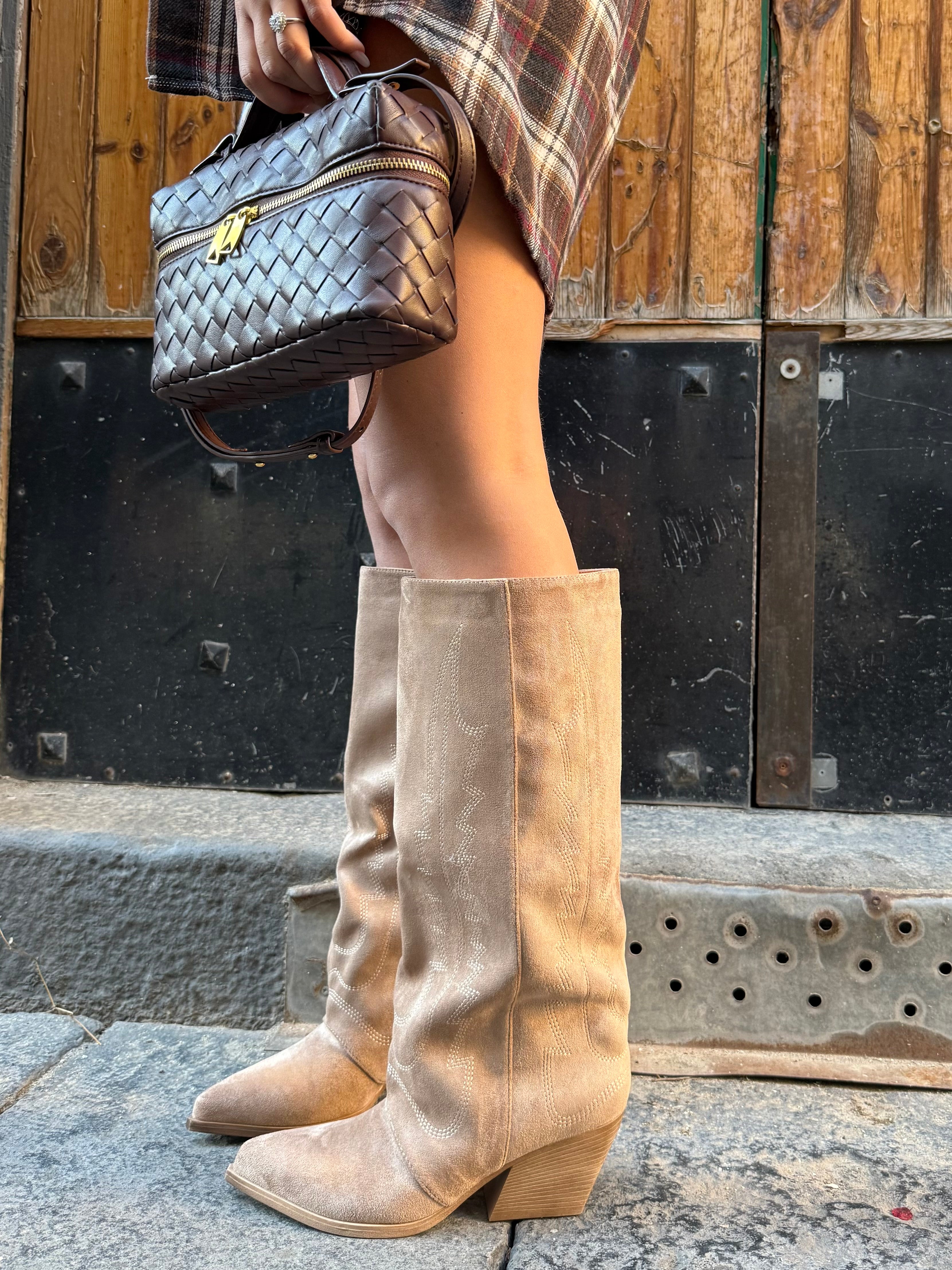 Questi stivali camperos in cachi chiaro rappresentano l’incontro perfetto tra design audace e funzionalità. Il gambale largo è studiato per garantire comfort e libertà di movimento, donando un’allure contemporanea e versatile.