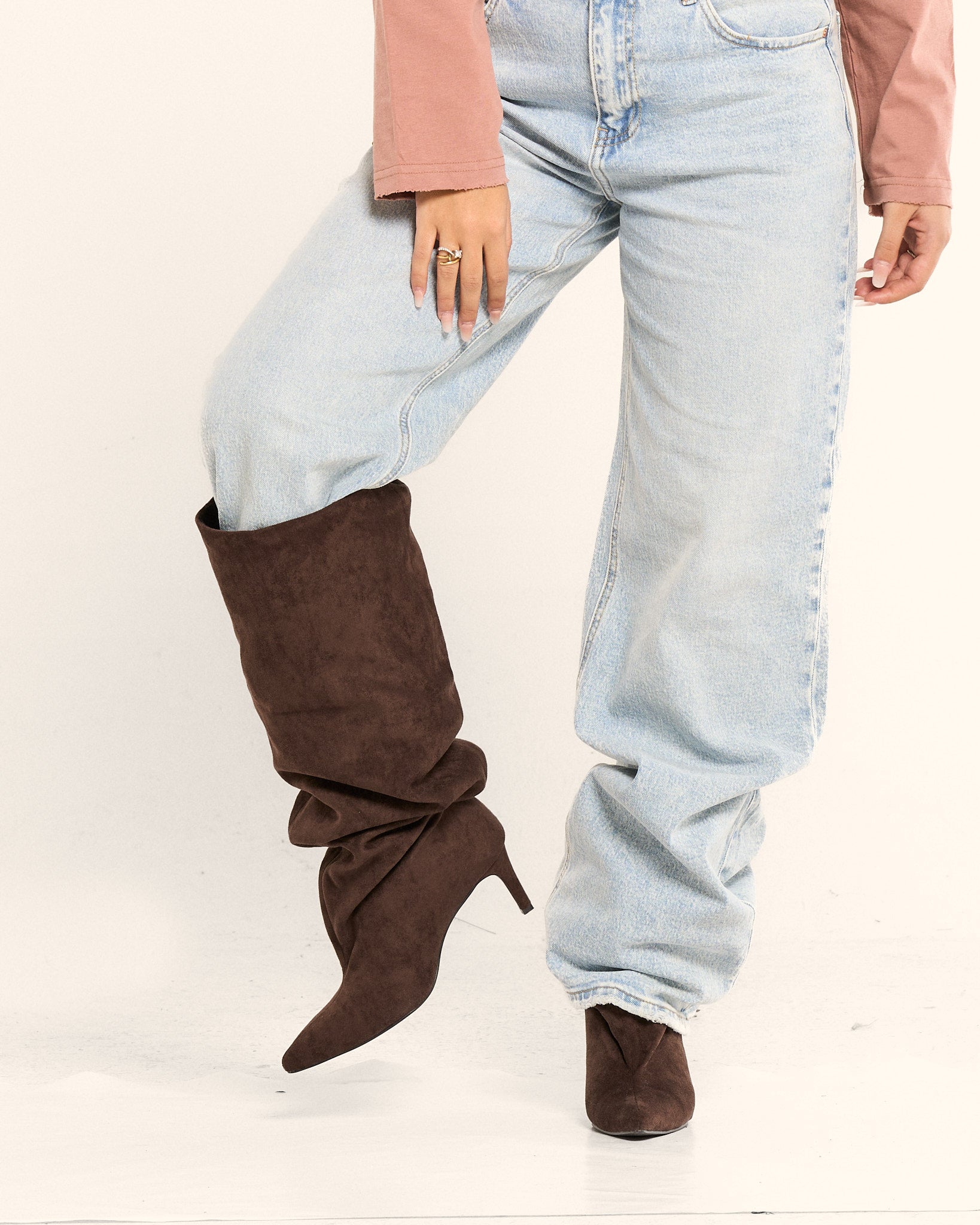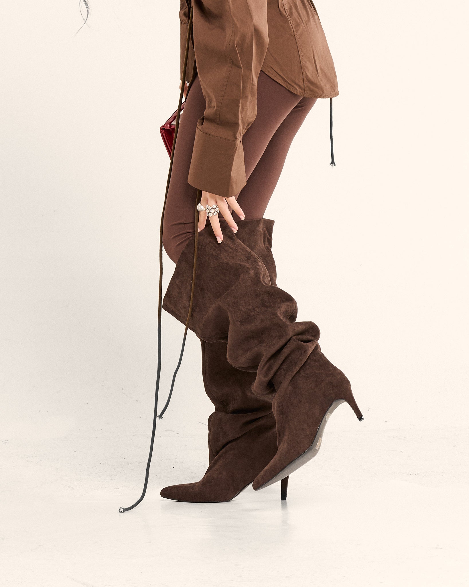 Stivali alti in eco-camoscio, con linea morbida e arricciata lungo la gamba. Il tacco sottile e la punta leggermente affusolata slanciano la silhouette, donando un tocco elegante anche ai look più casual. Comodi, femminili e super versatili: perfetti con leggings, mini dress o gonne midi per uno stile sofisticato e deciso.