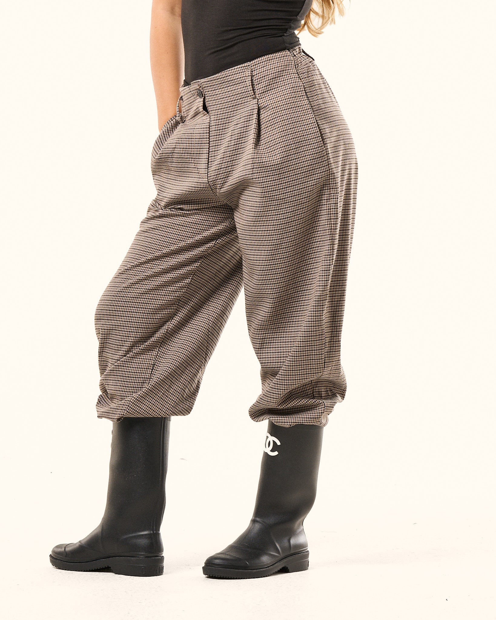 Tailleur composto da blazer crop e pantalone a vita alta in fantasia micro-check, ideale per chi ama uno stile ricercato ma senza eccessi.