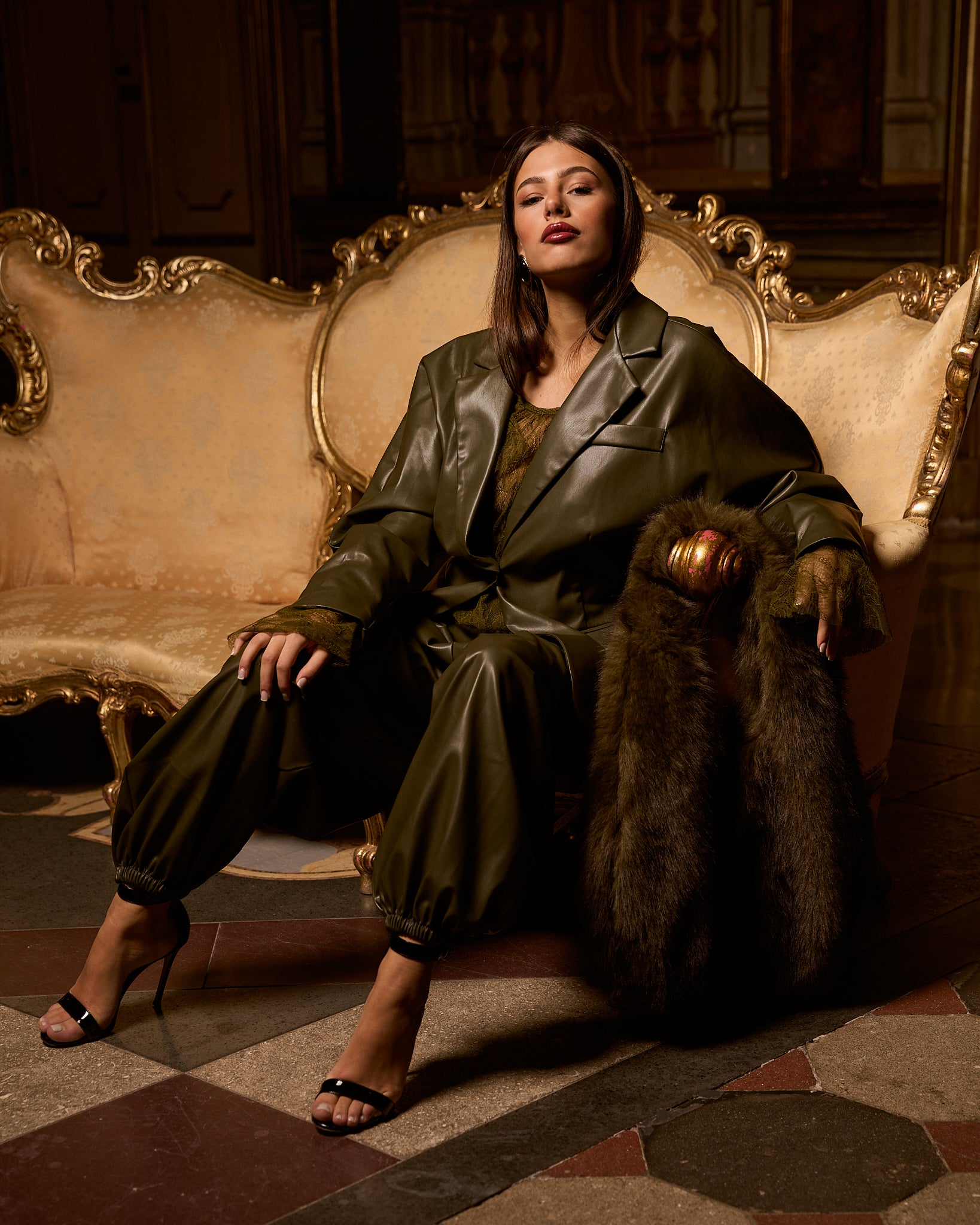 da giacca over dal taglio ampio e strutturato e pantalone con arricciamento che aggiunge movimento e stile al look. Il materiale in pelle conferisce un tocco audace e lussuoso, rendendo il coordinato perfetto per chi cerca un outfit fashion, sofisticato e di carattere.