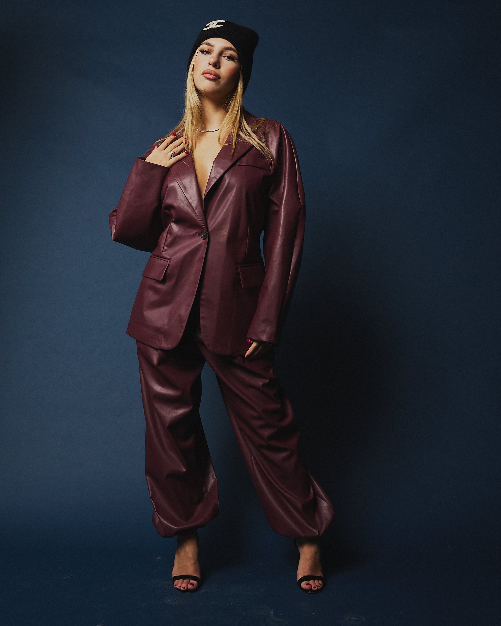 da giacca over dal taglio ampio e strutturato e pantalone con arricciamento che aggiunge movimento e stile al look. Il materiale in pelle conferisce un tocco audace e lussuoso, rendendo il coordinato perfetto per chi cerca un outfit fashion, sofisticato e di carattere.