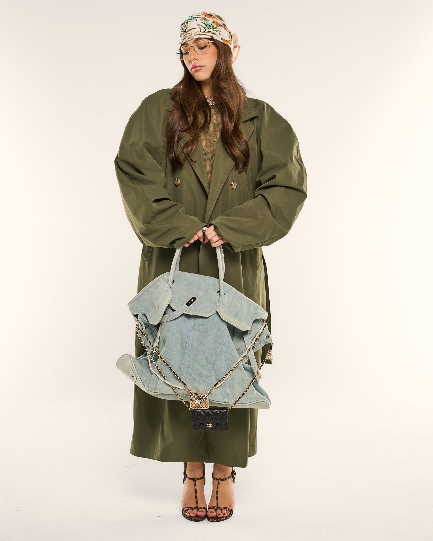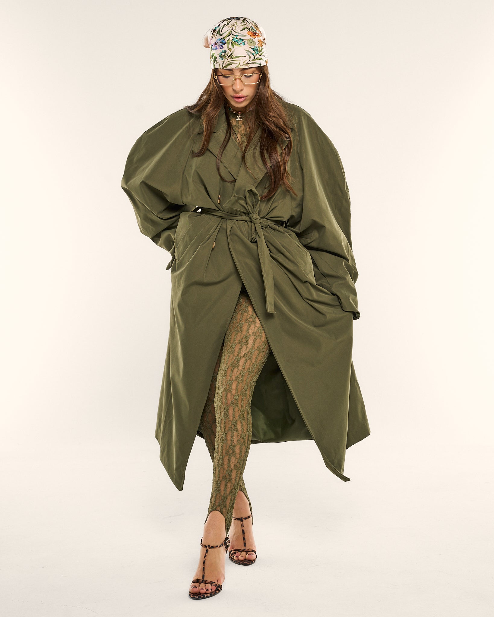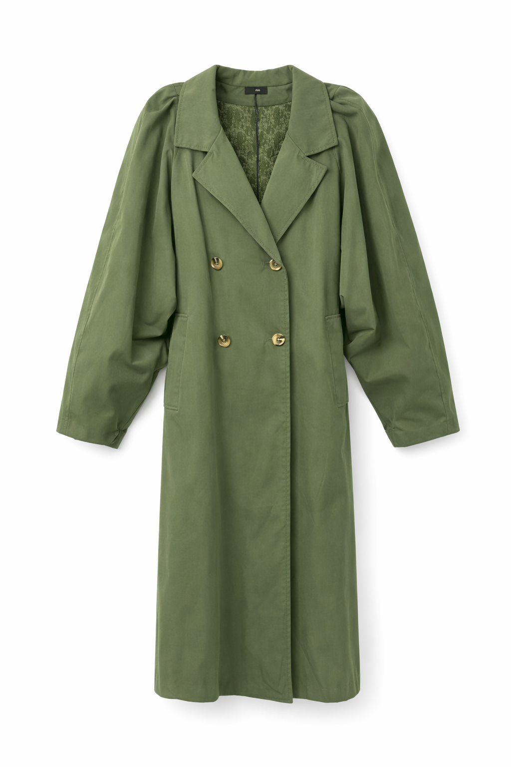 Trench lungo verde oliva con chiusura doppiopetto e bottoni gold. Linea morbida e moderna, perfetto per look quotidiani raffinati e layering di stagione.