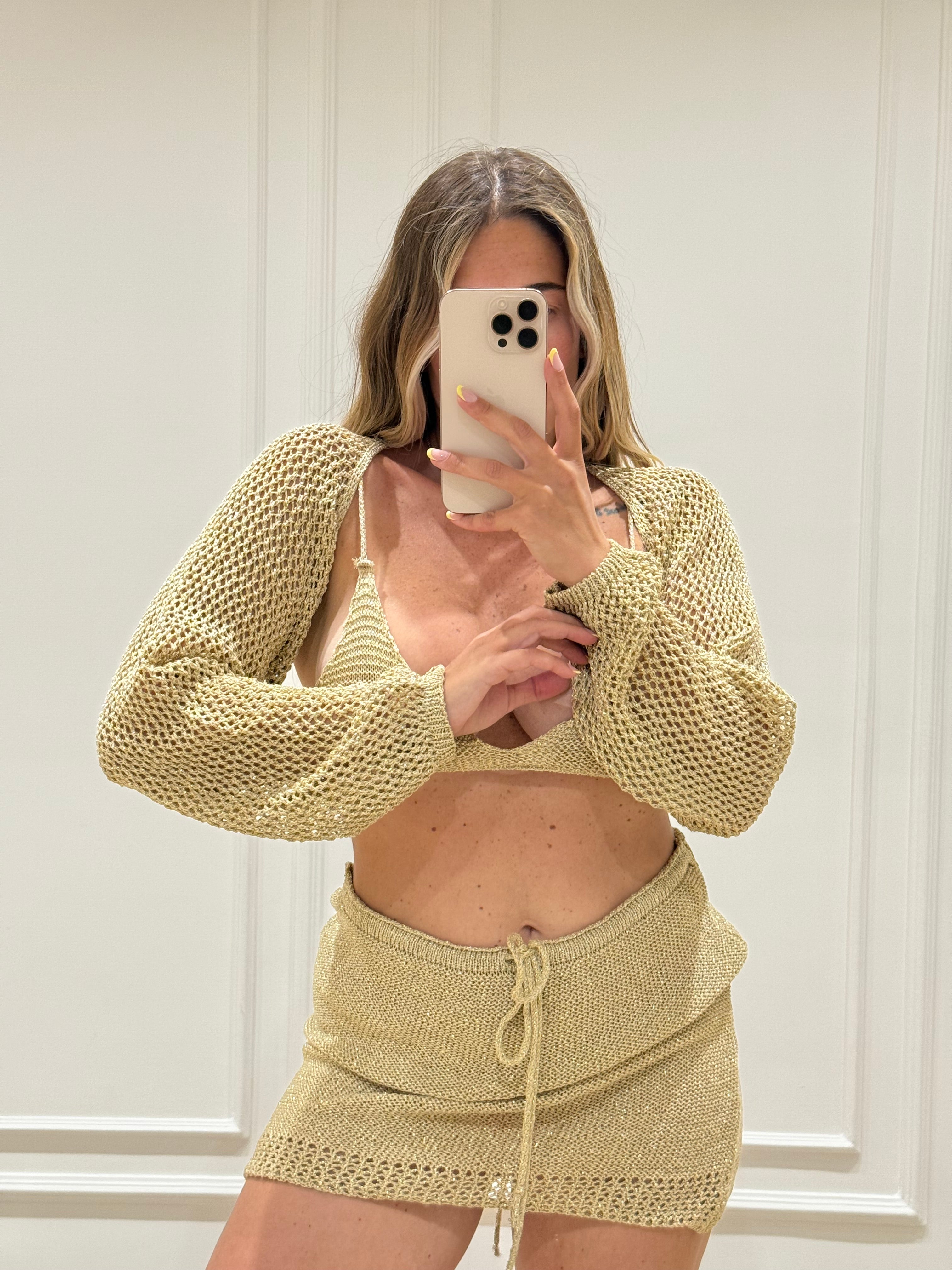 Immergiti nel lusso e nella sofisticatezza con il nostro set Tris Mare Gold, composto da una gonna triangolare e un copri-spalla realizzato ad uncinetto con tessuto Lurex di alta qualità.